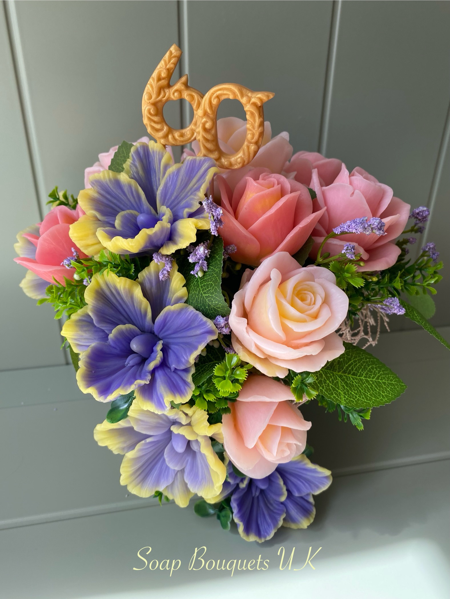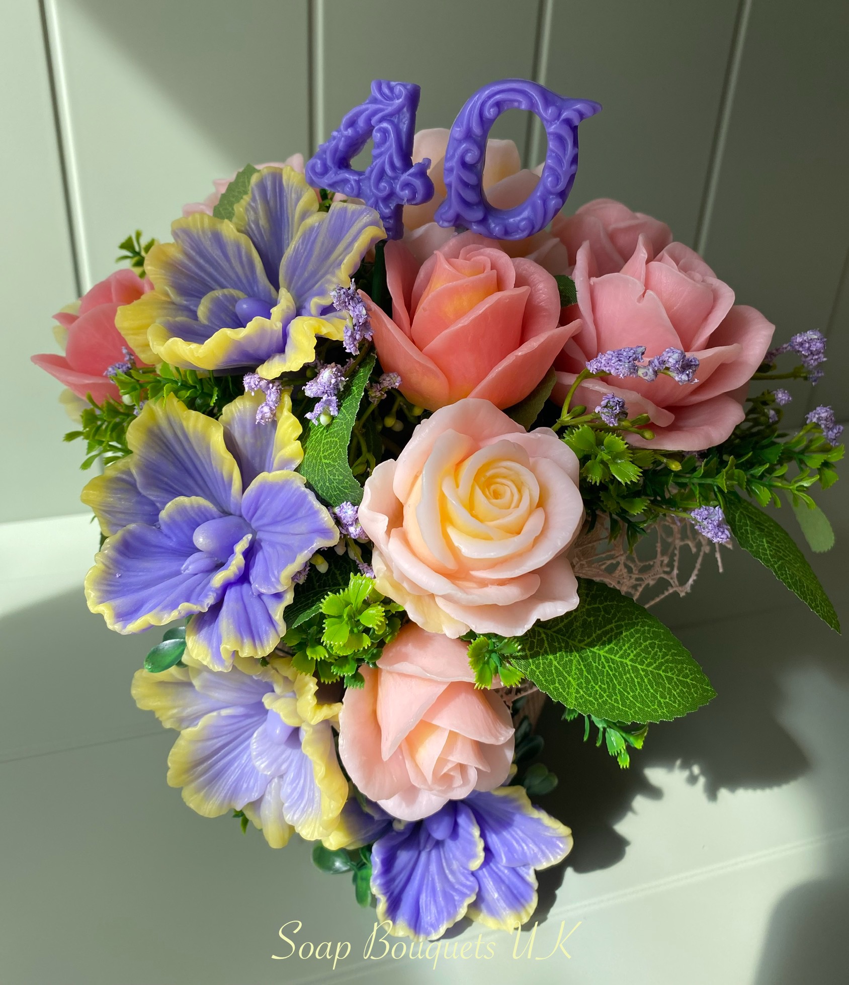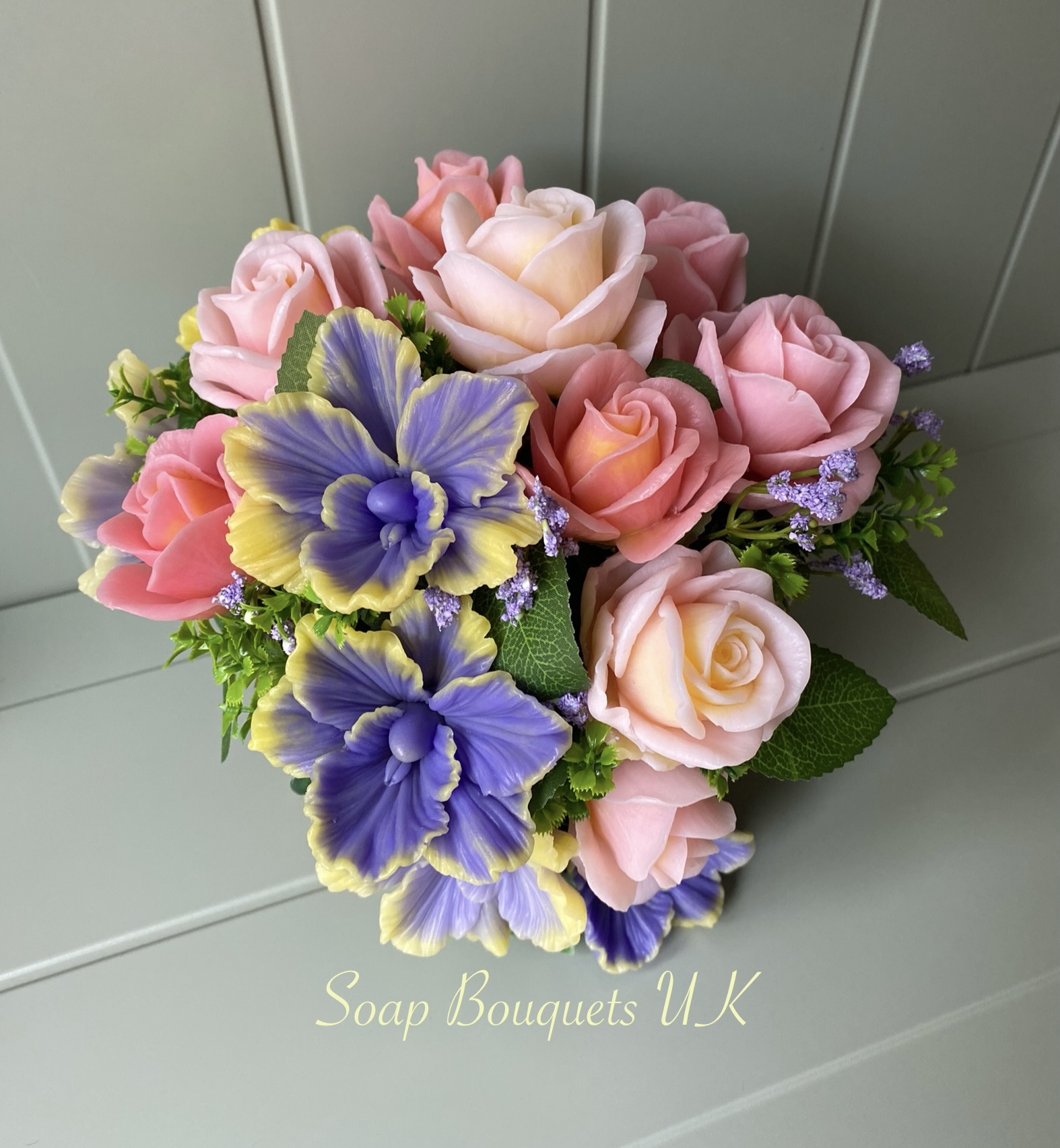 • Flowers: 15 handcrafted scented soap flowers – 6 vibrant purple and yellow orchids & 9 soft pink roses.