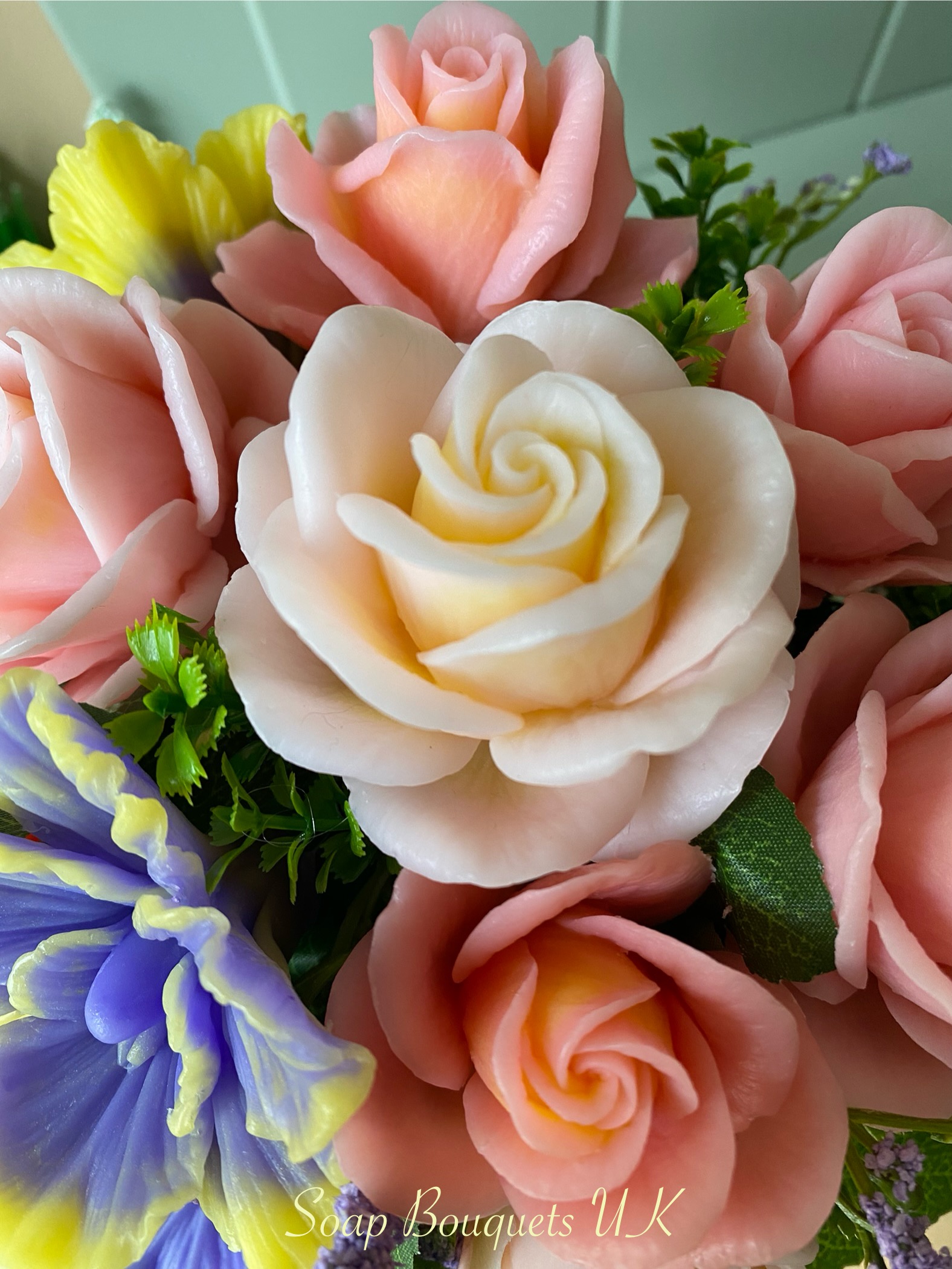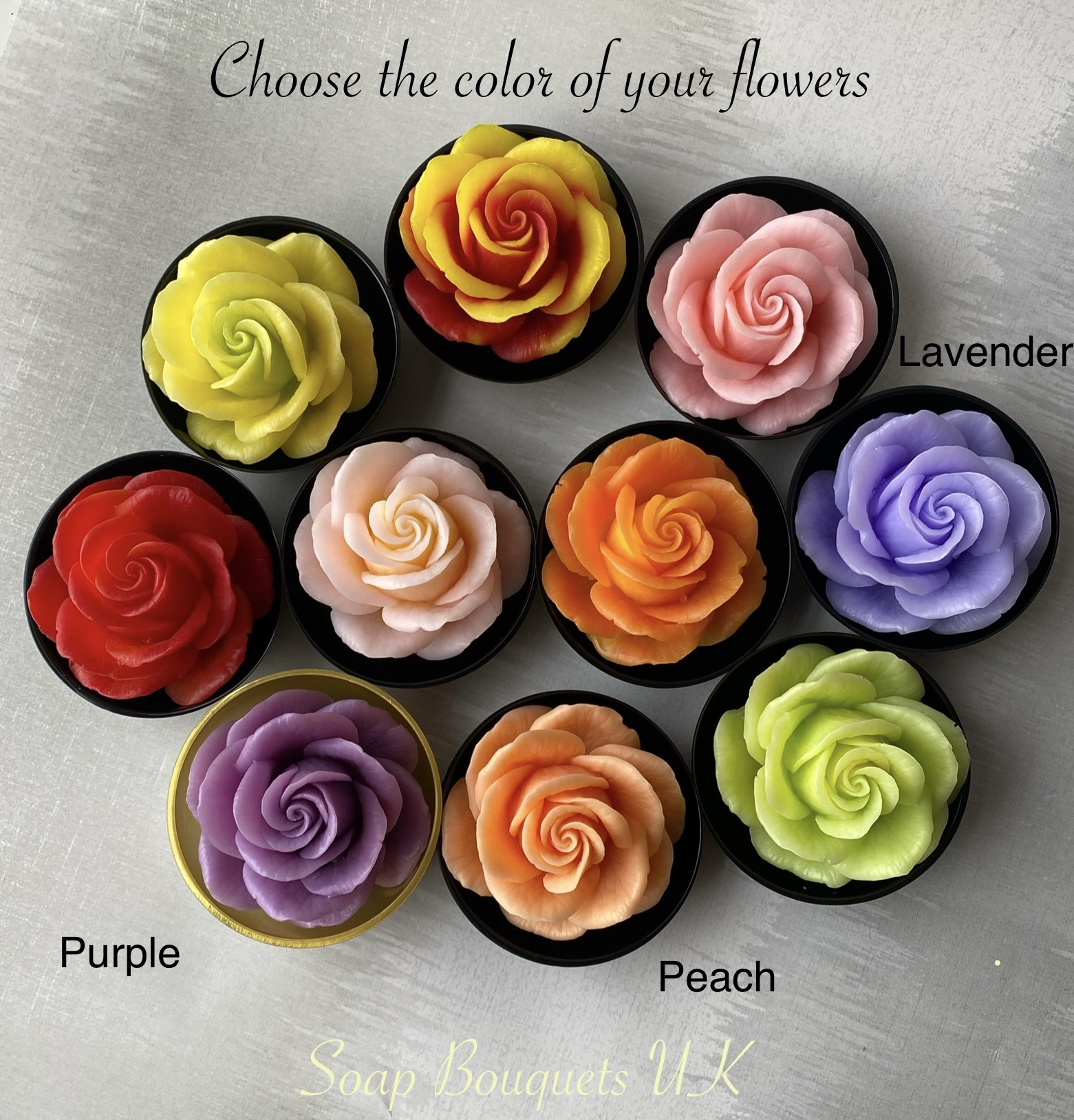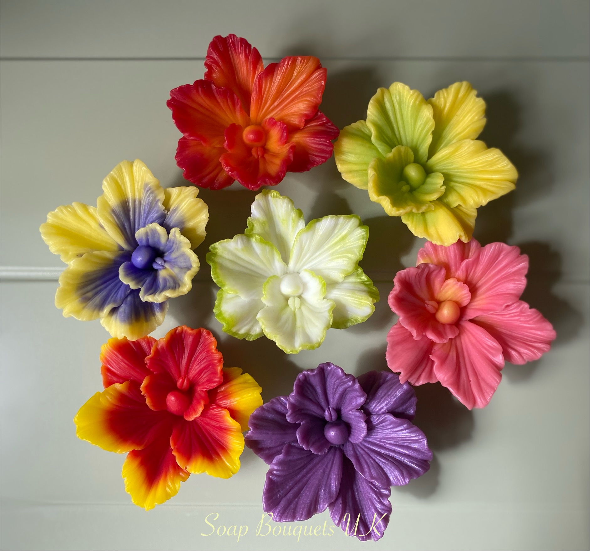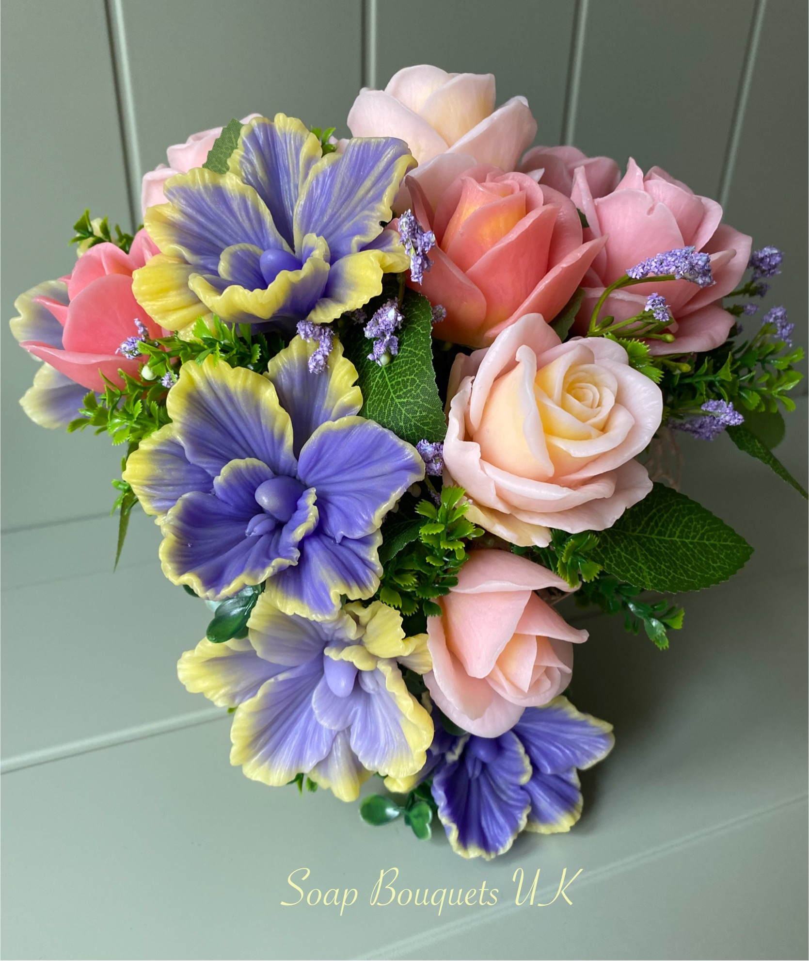 • Flowers: 15 handcrafted scented soap flowers – 6 vibrant purple and yellow orchids & 9 soft pink roses.