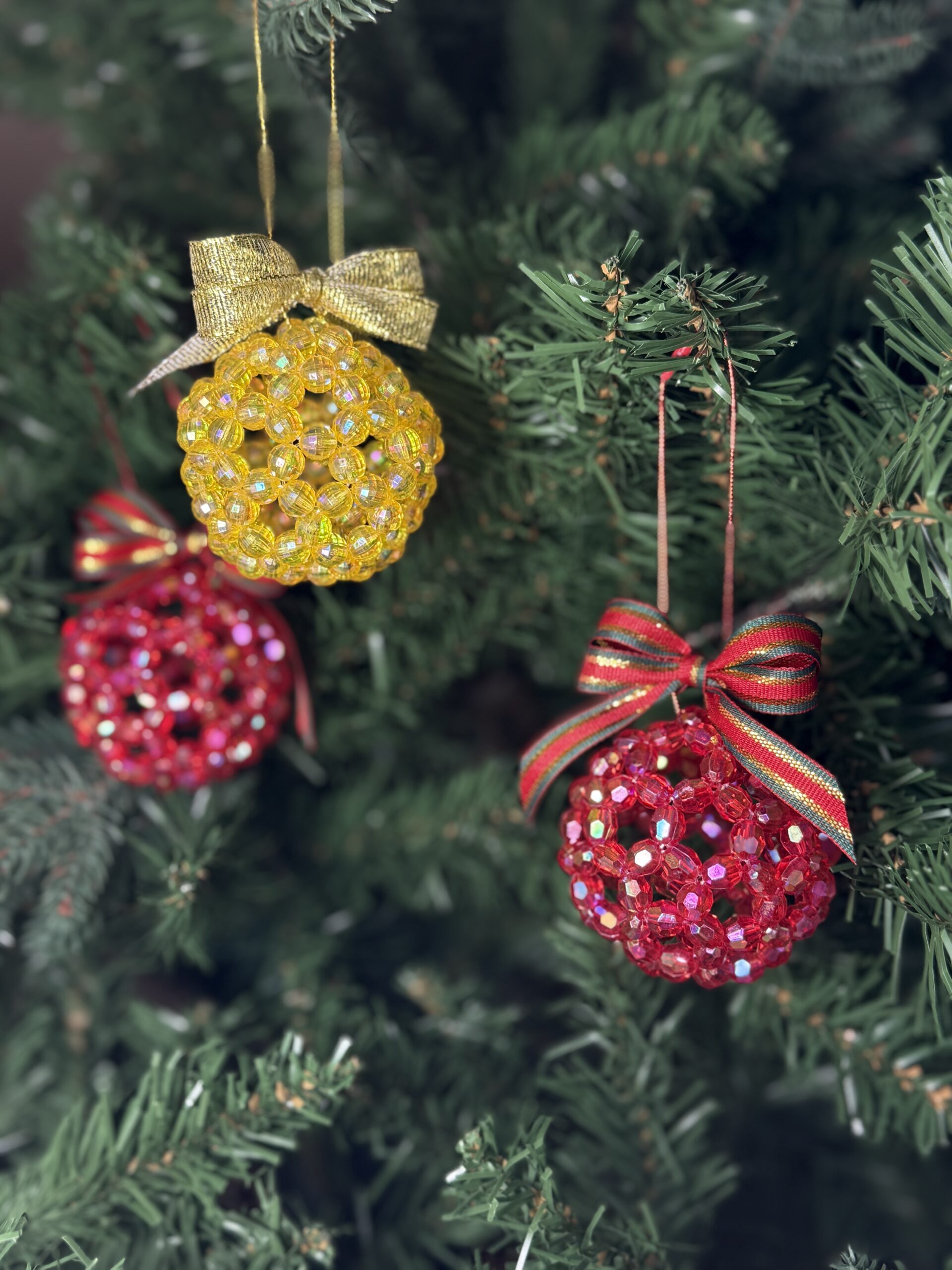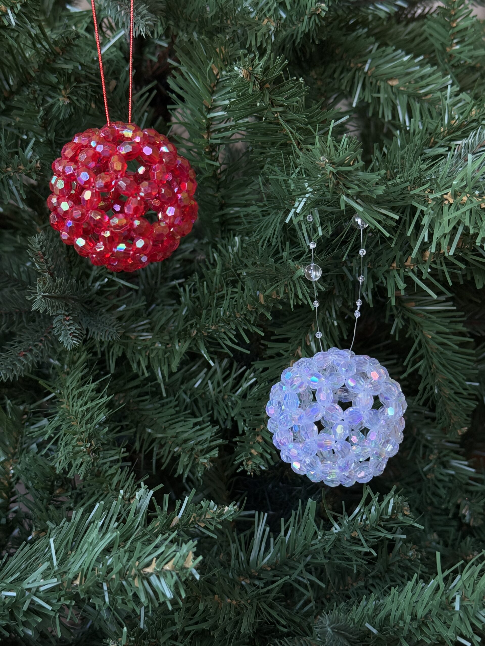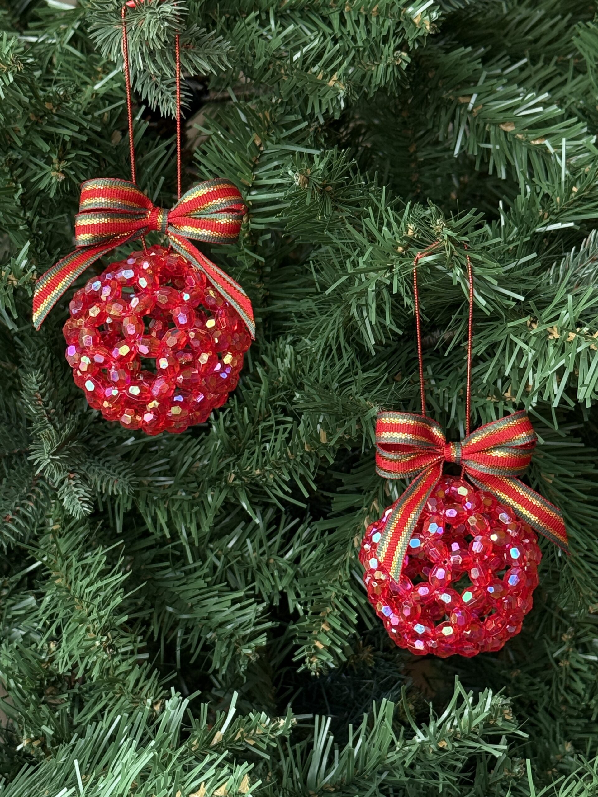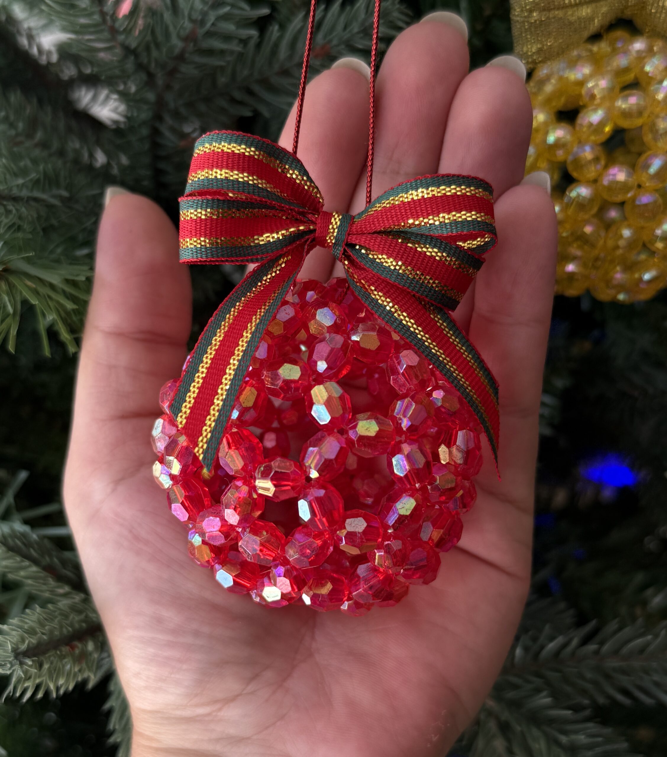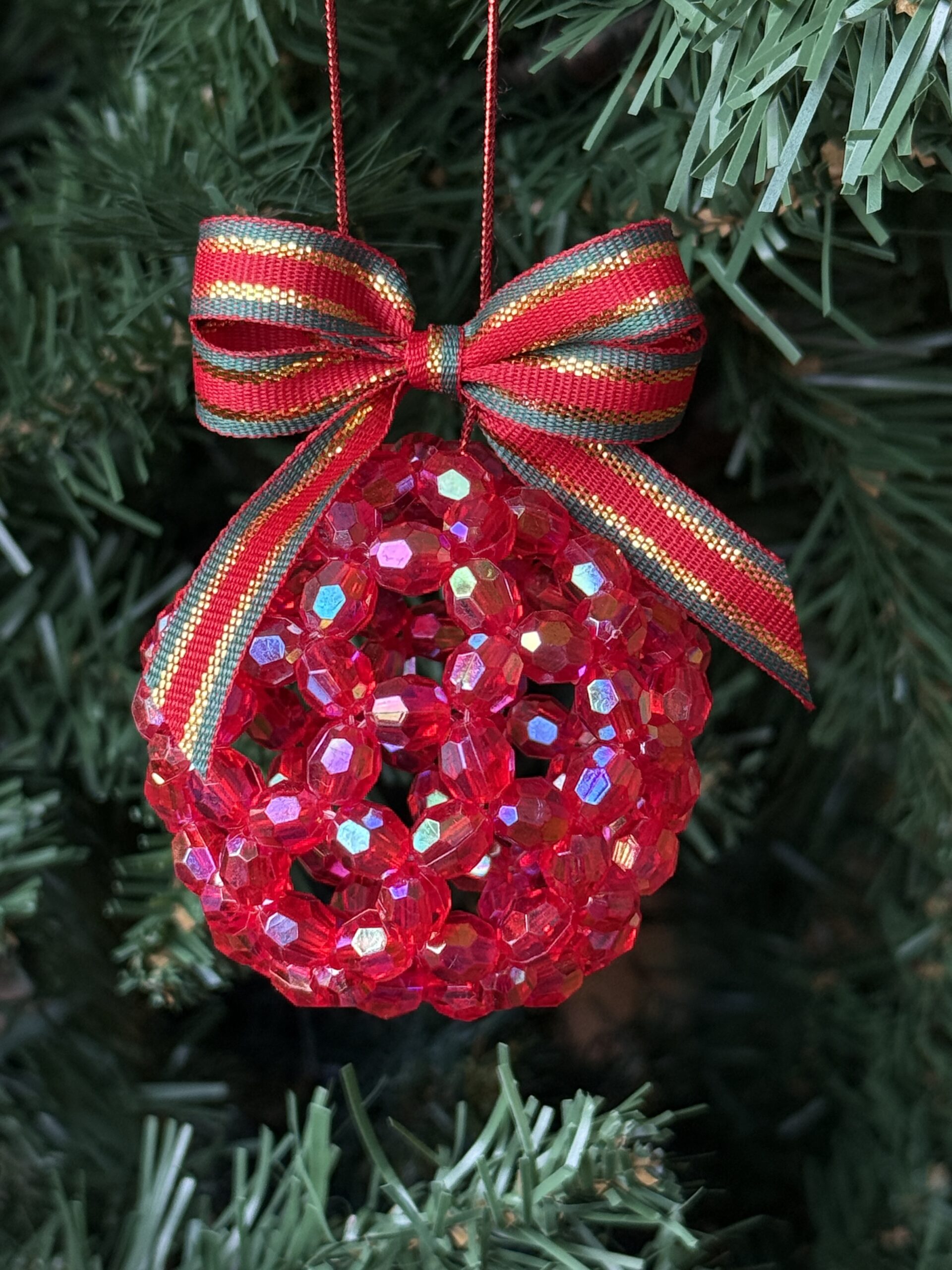 Make your Christmas tree shine with this handmade beaded sparkle Christmas bauble in festive red. Carefully woven from iridescent crystal-effect beads, this ornament beautifully reflects lights and adds a warm, traditional glow to your holiday decor.