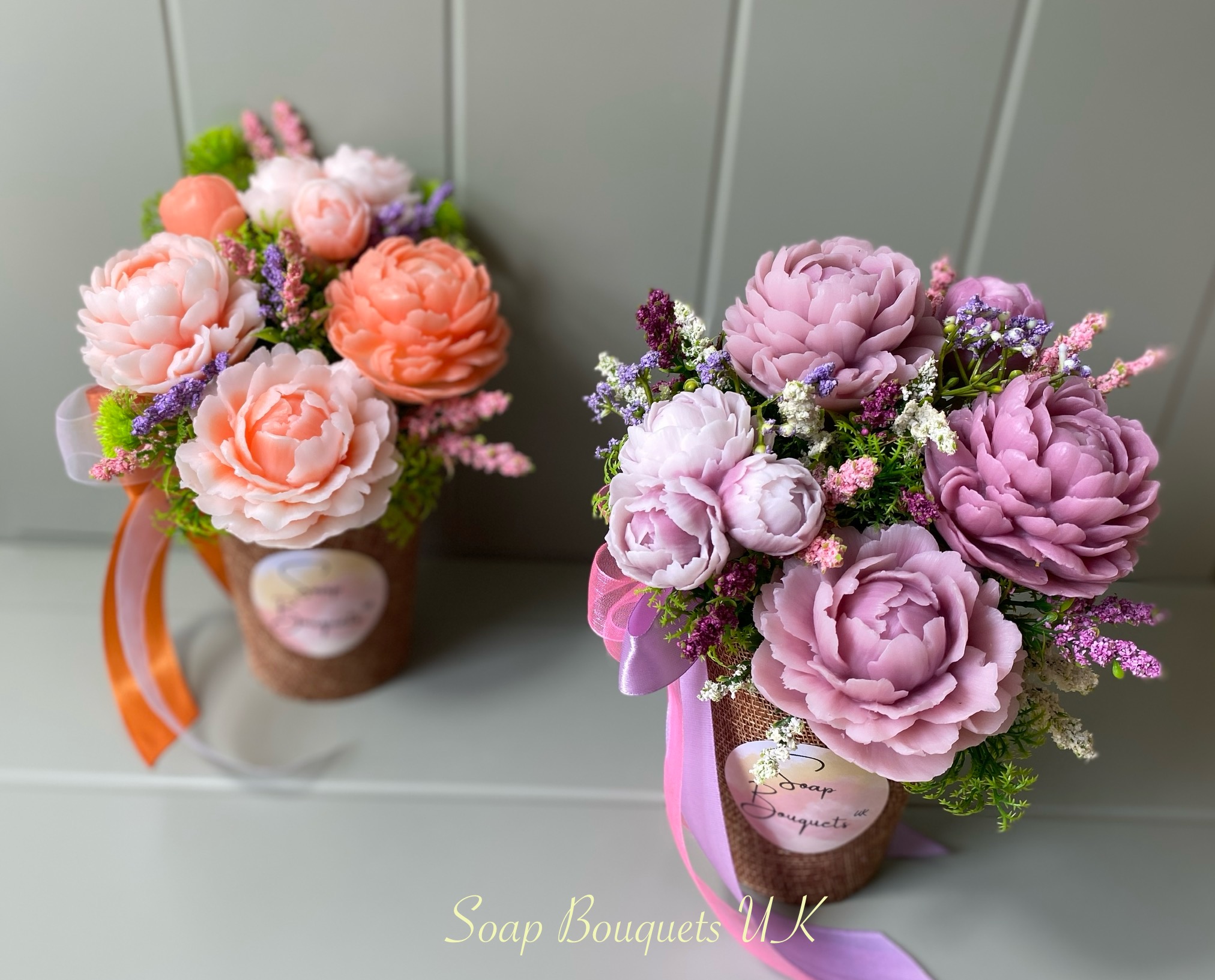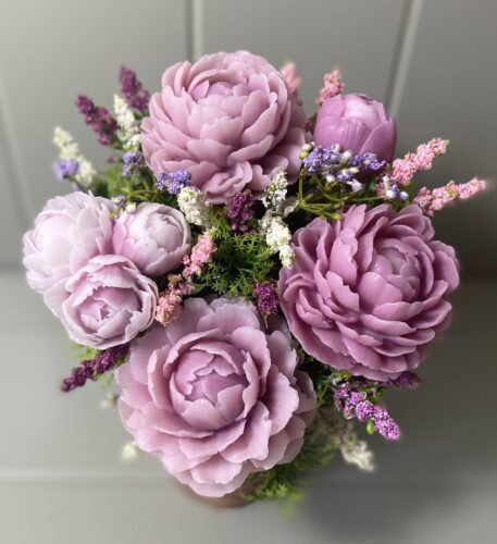 A handcrafted vegan peony soap bouquet – 7 lifelike peony soap flowers, delicately scented and customisable. A luxurious, long-lasting gift for her.