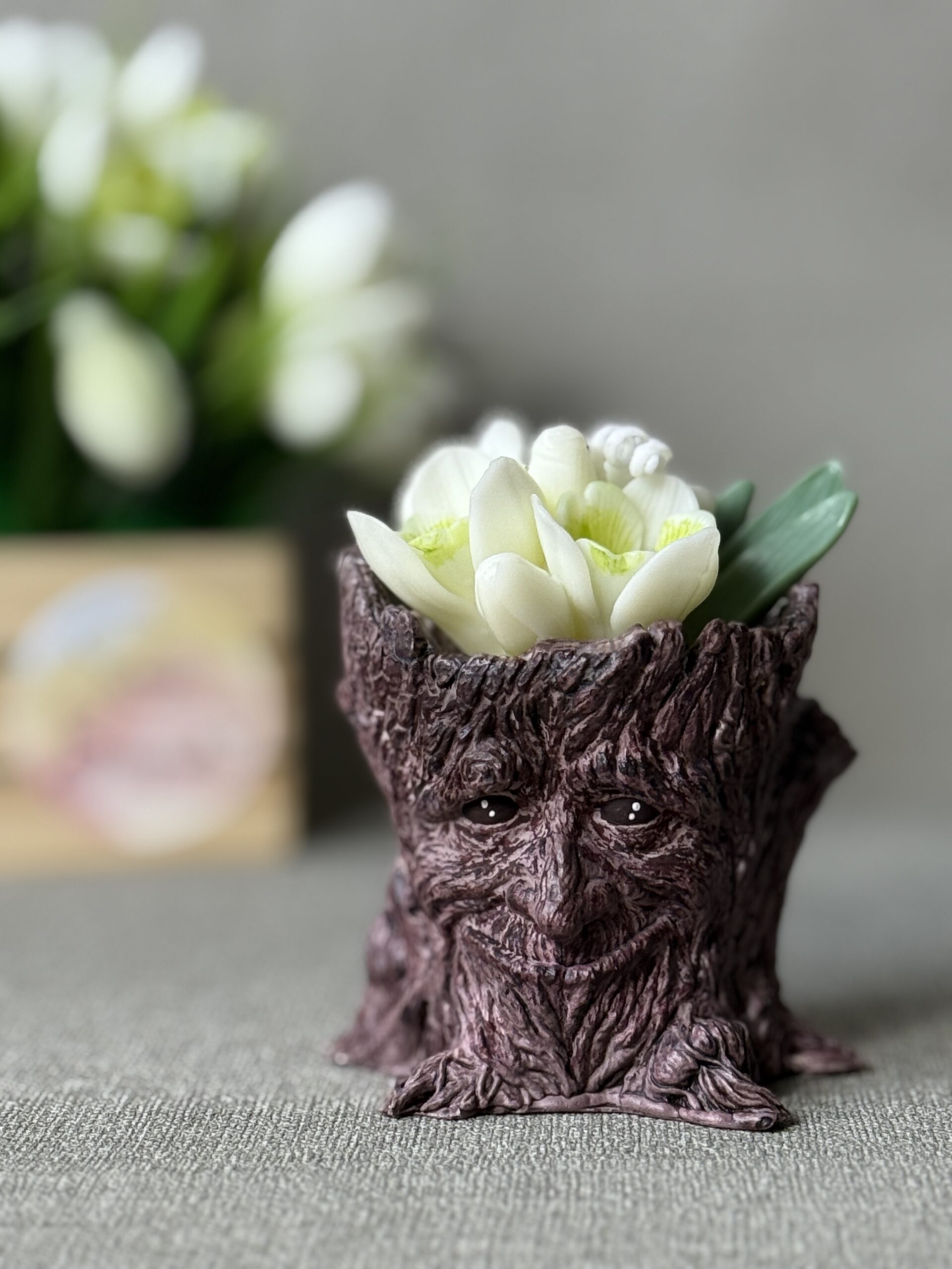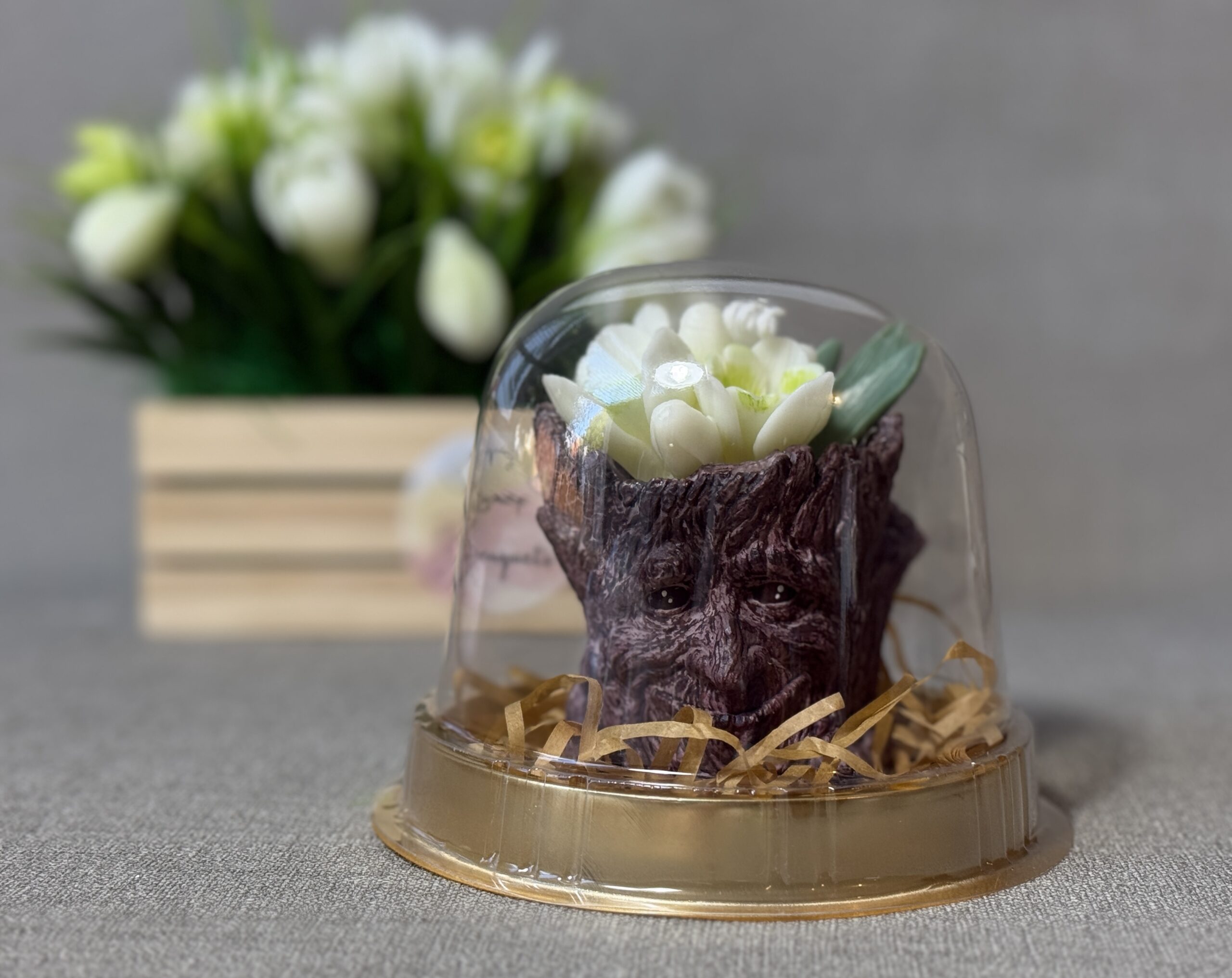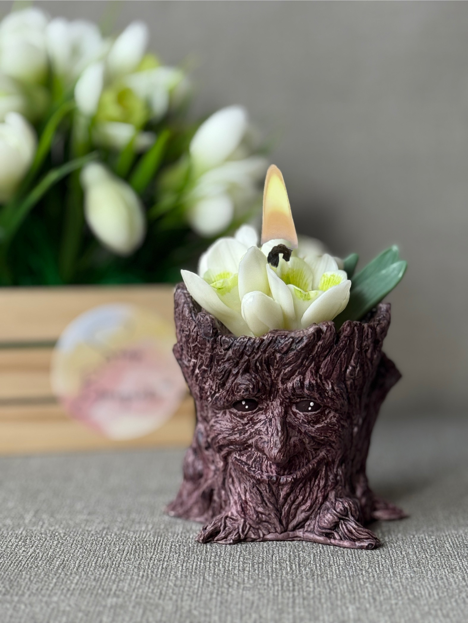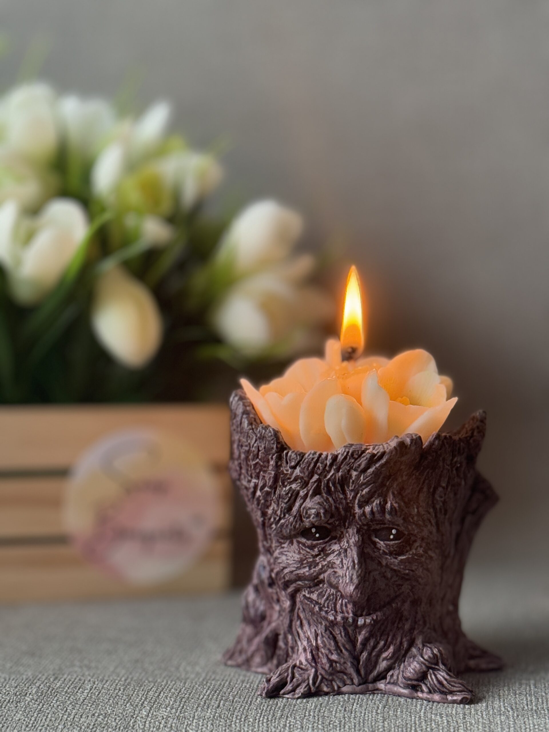 - Design: Snowdrop flower candle in rustic stump holder