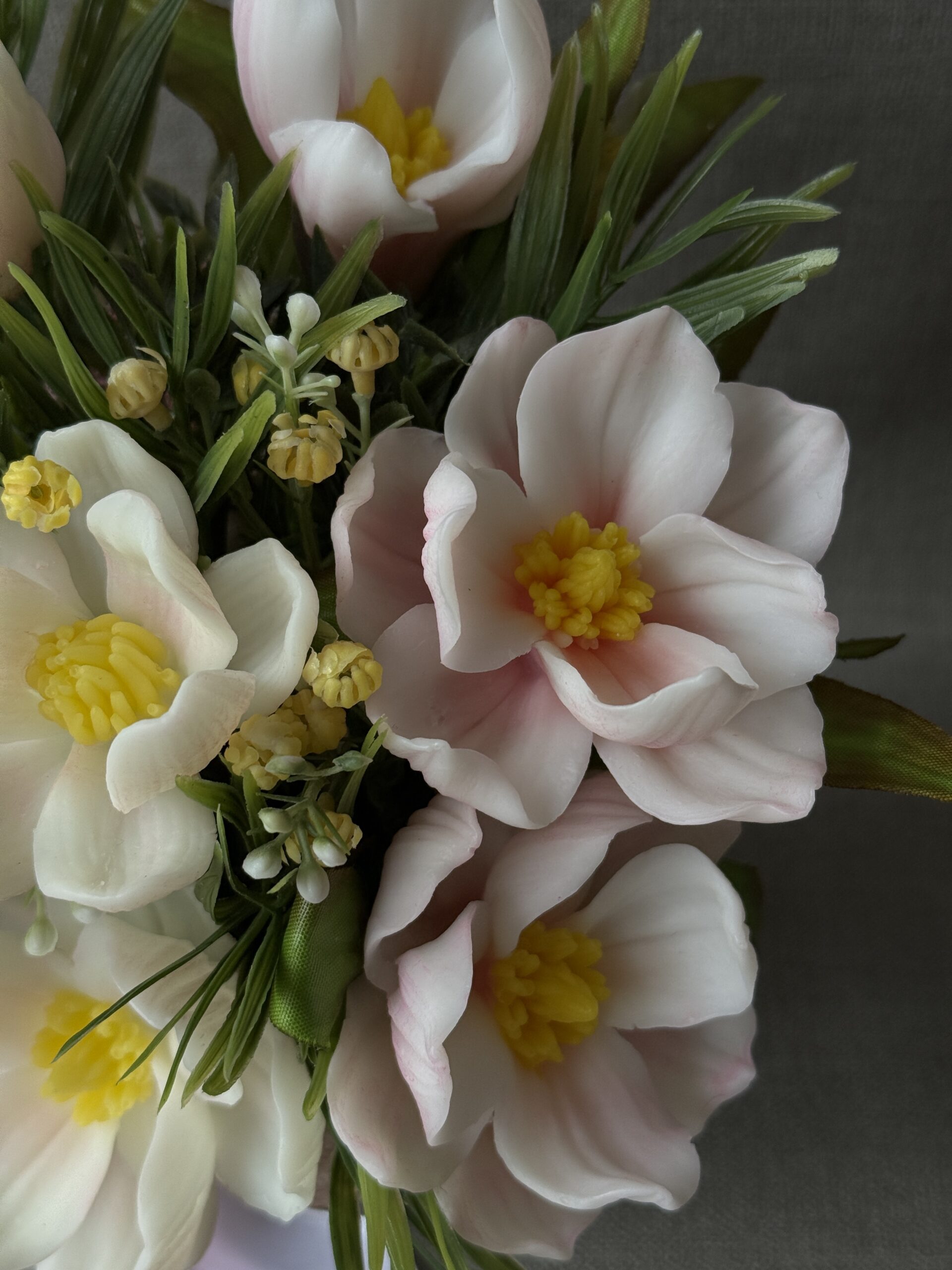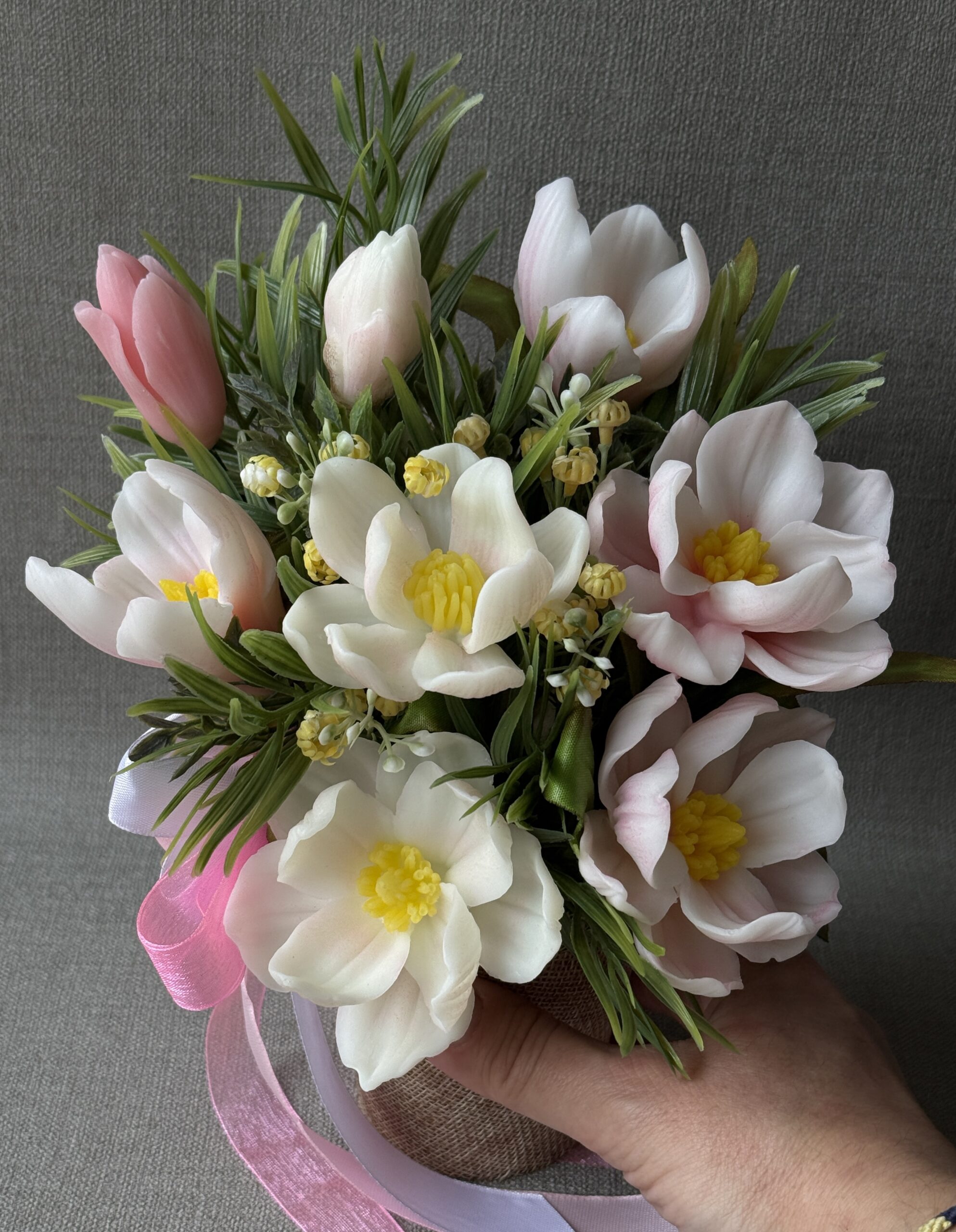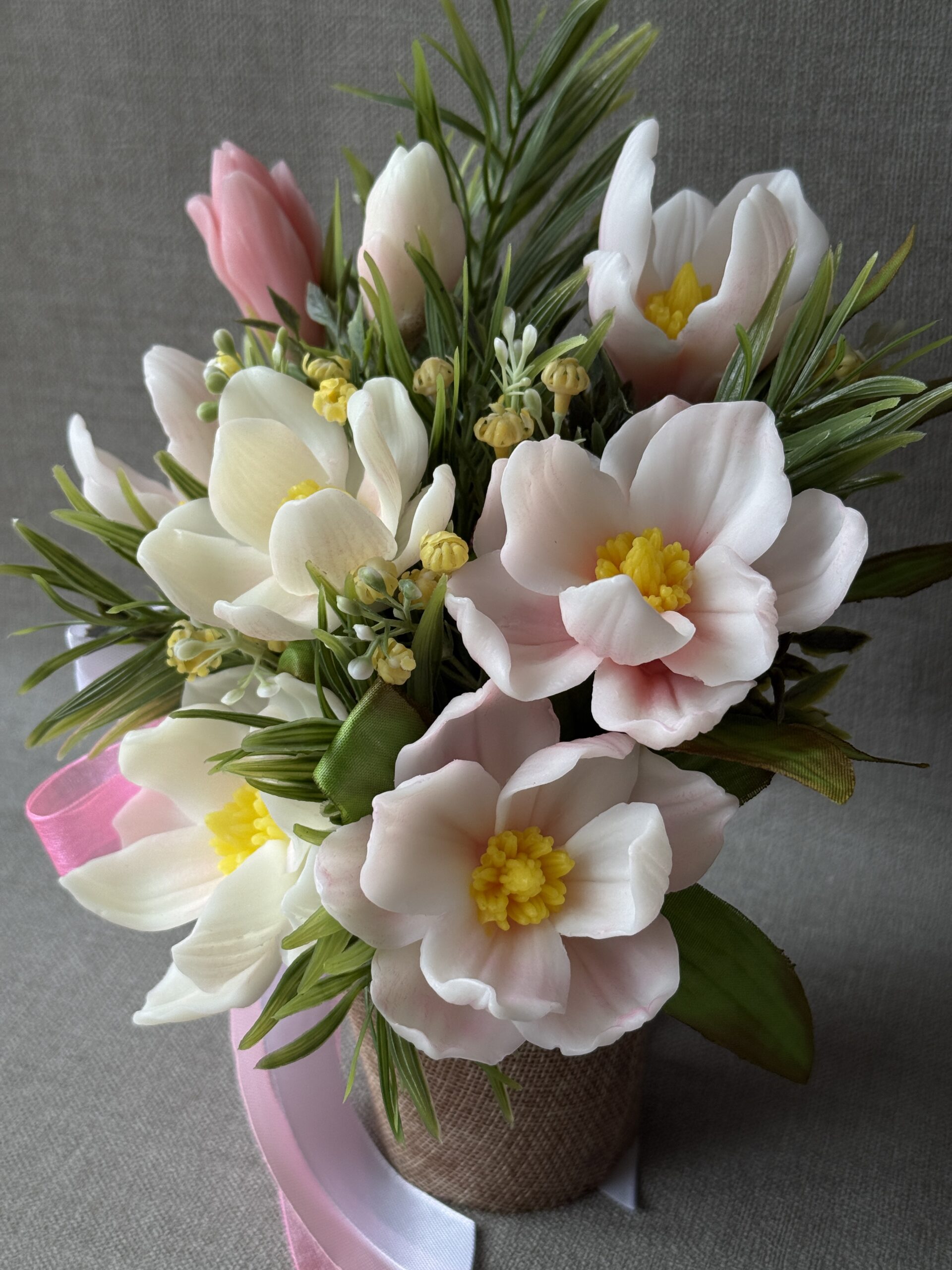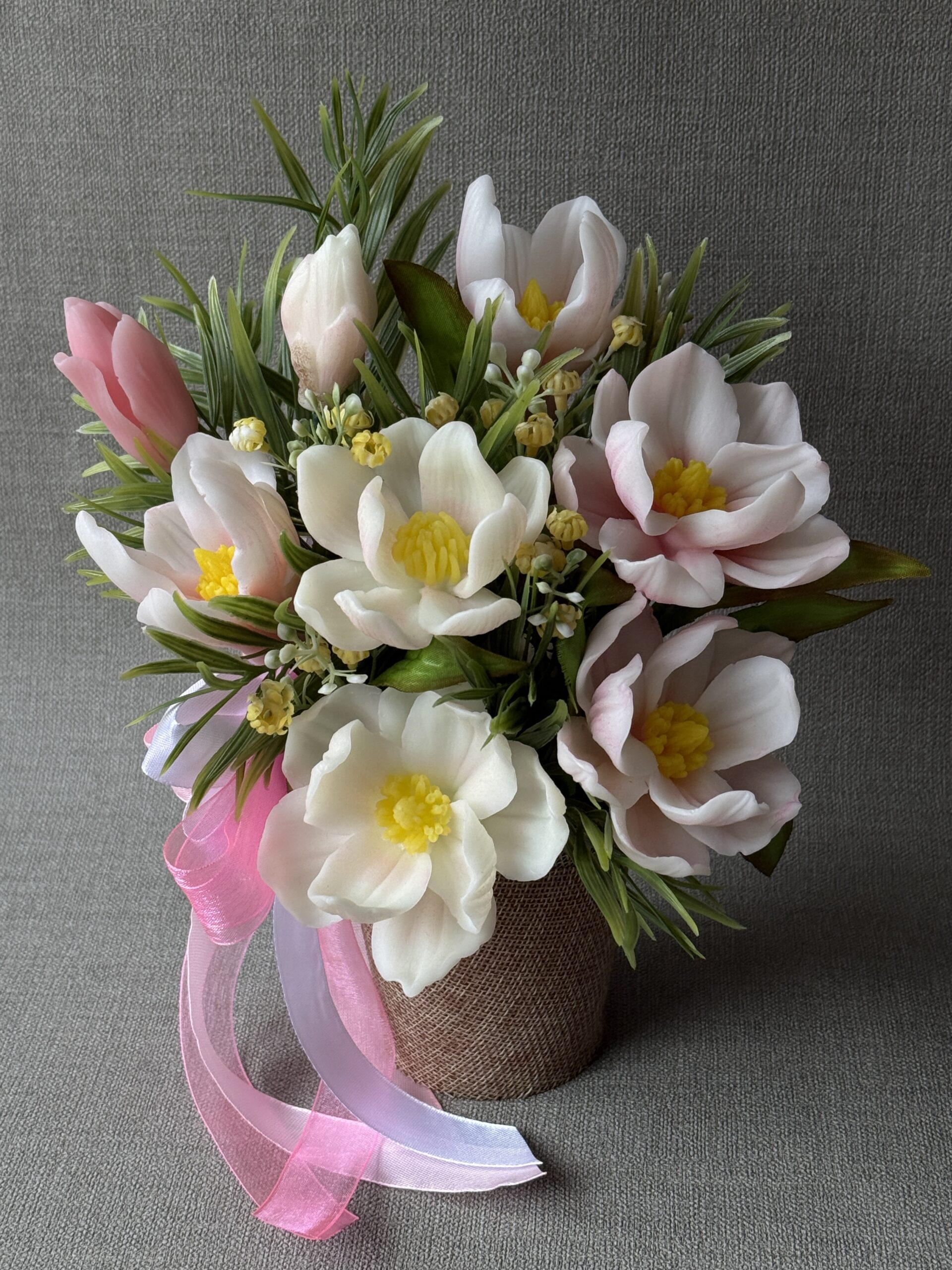 This arrangement is created from delicately shaped decorative soap flowers, offering both visual appeal and craftsmanship. The result is a long-lasting floral accent that enhances your home with understated charm.