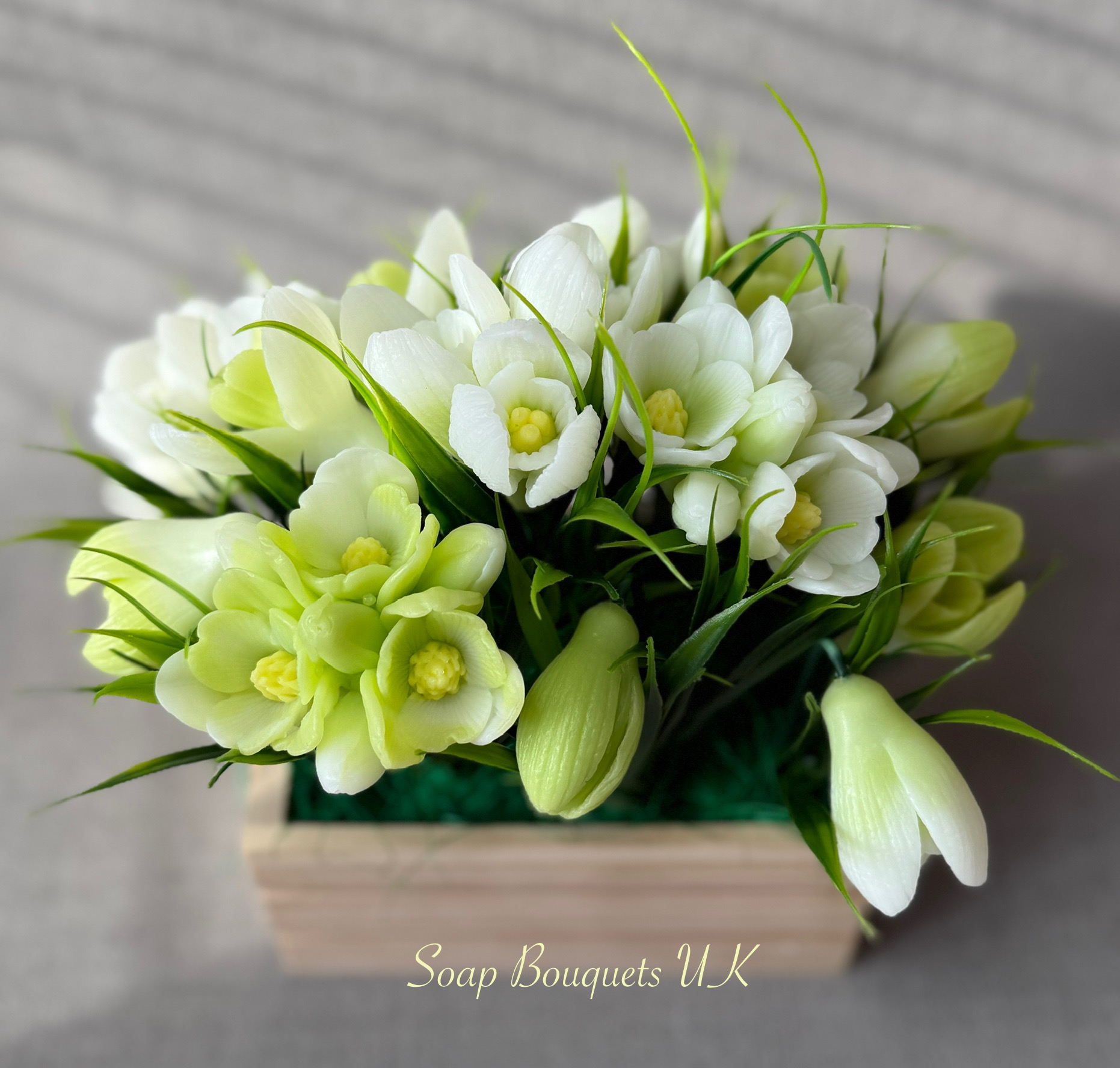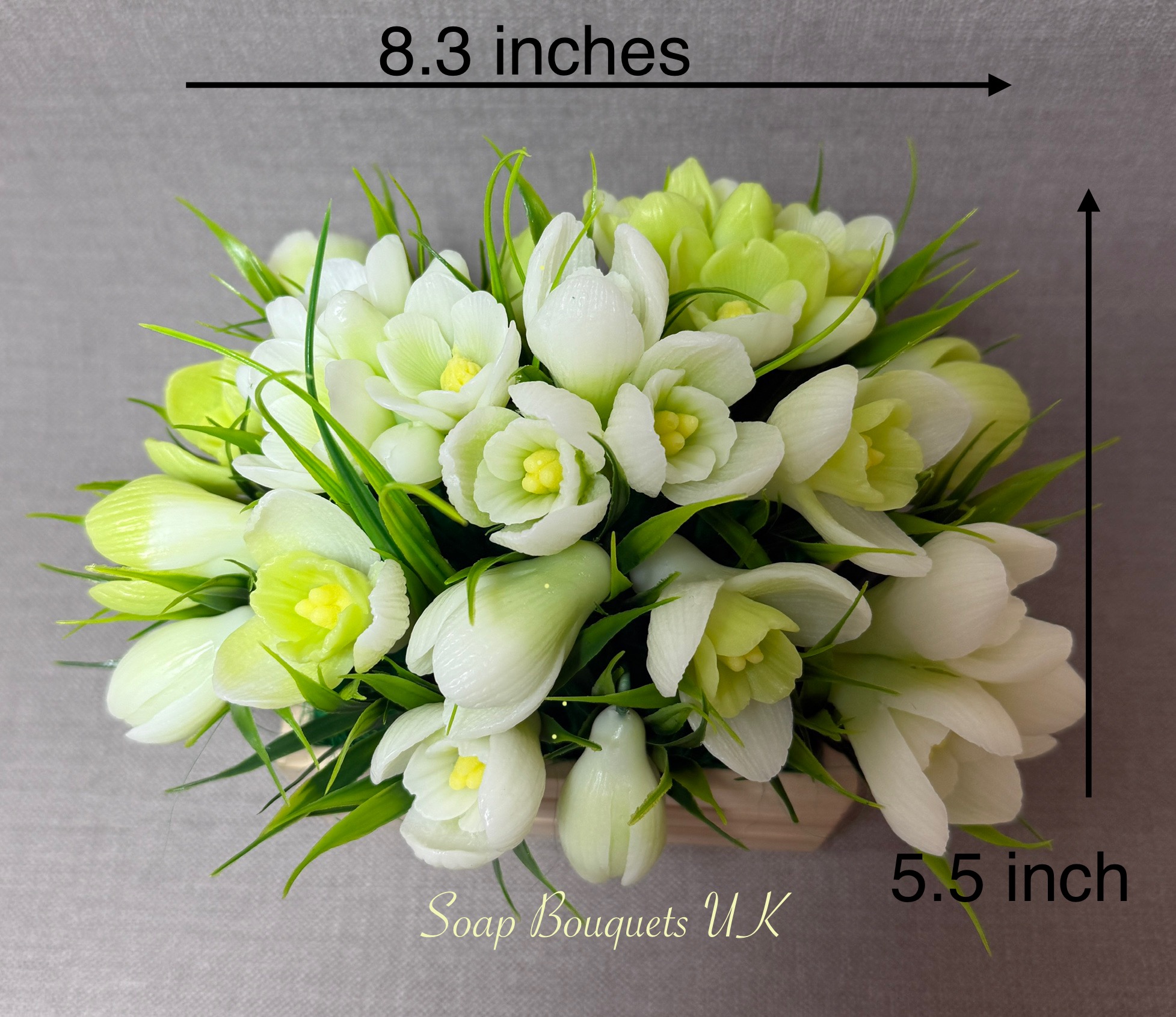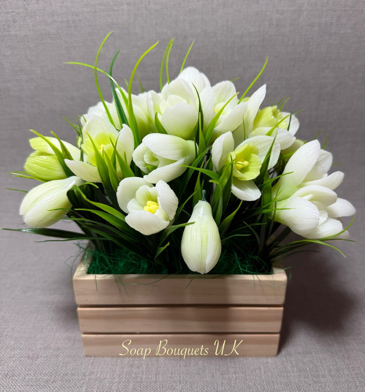 • Flowers: Includes delicate snowdrops, each meticulously crafted from high-quality scented glycerine soap. Designed with exquisite detail, this lifelike arrangement captures the elegance of spring’s first blooms.