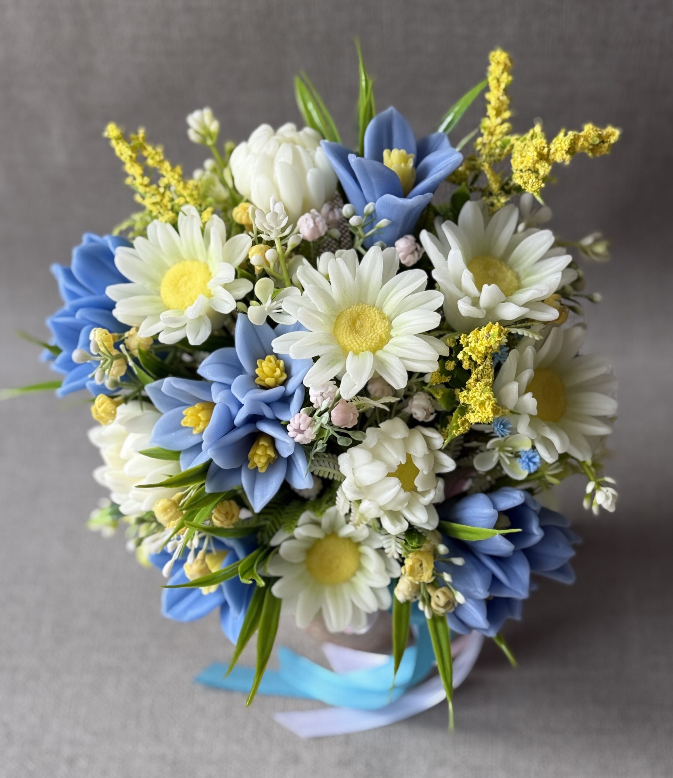 This beautifully handcrafted bouquet of Daisies & Bluebells soap flowers combines the charm of traditional spring blooms with the indulgence of a luxury spa gift.