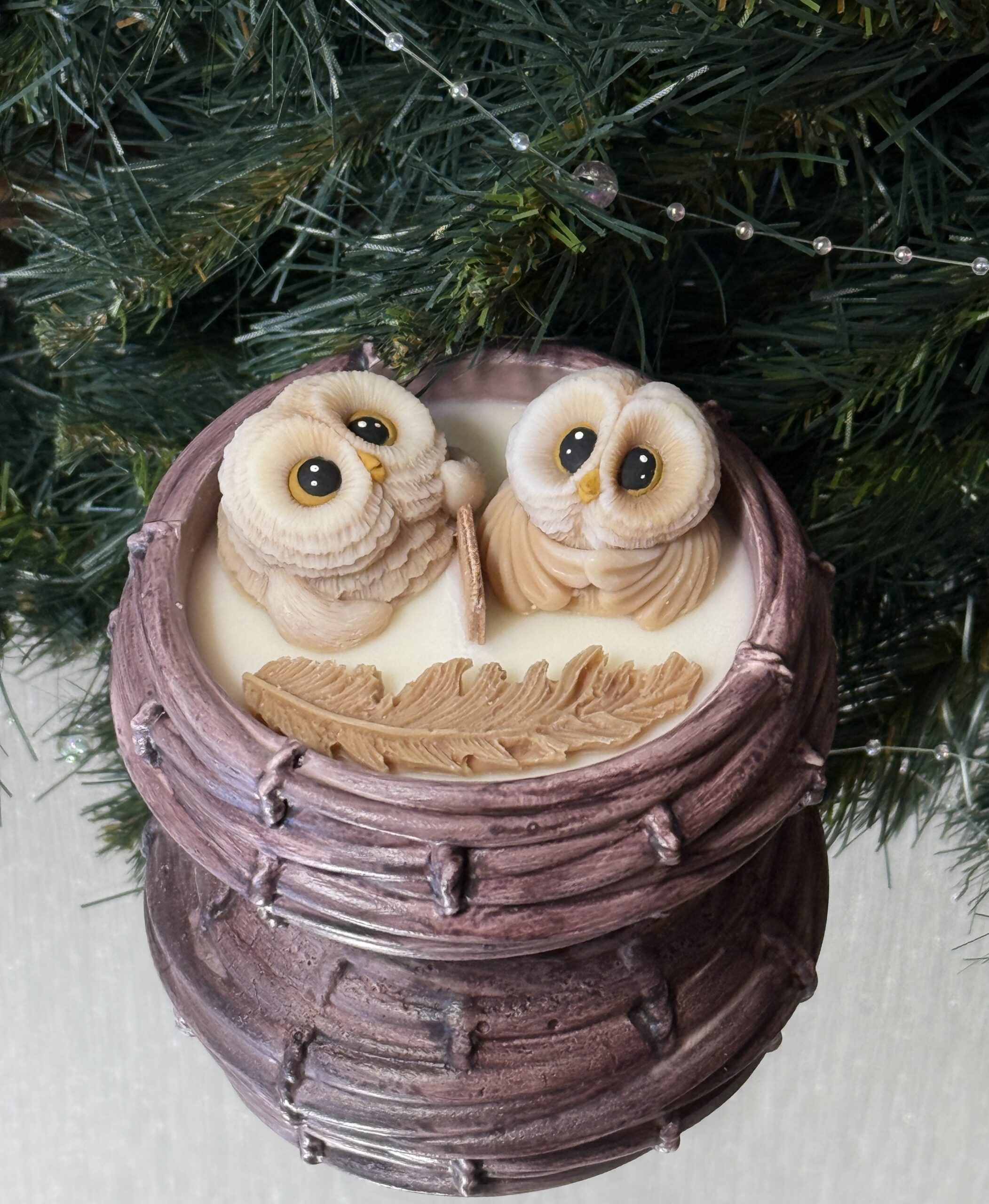 A unique Owl Gift for Women – Handmade owl candle poured from natural soy wax with a wood wick in a rustic holder. A thoughtful, limited-edition gift for women, ideal for Christmas or birthdays.