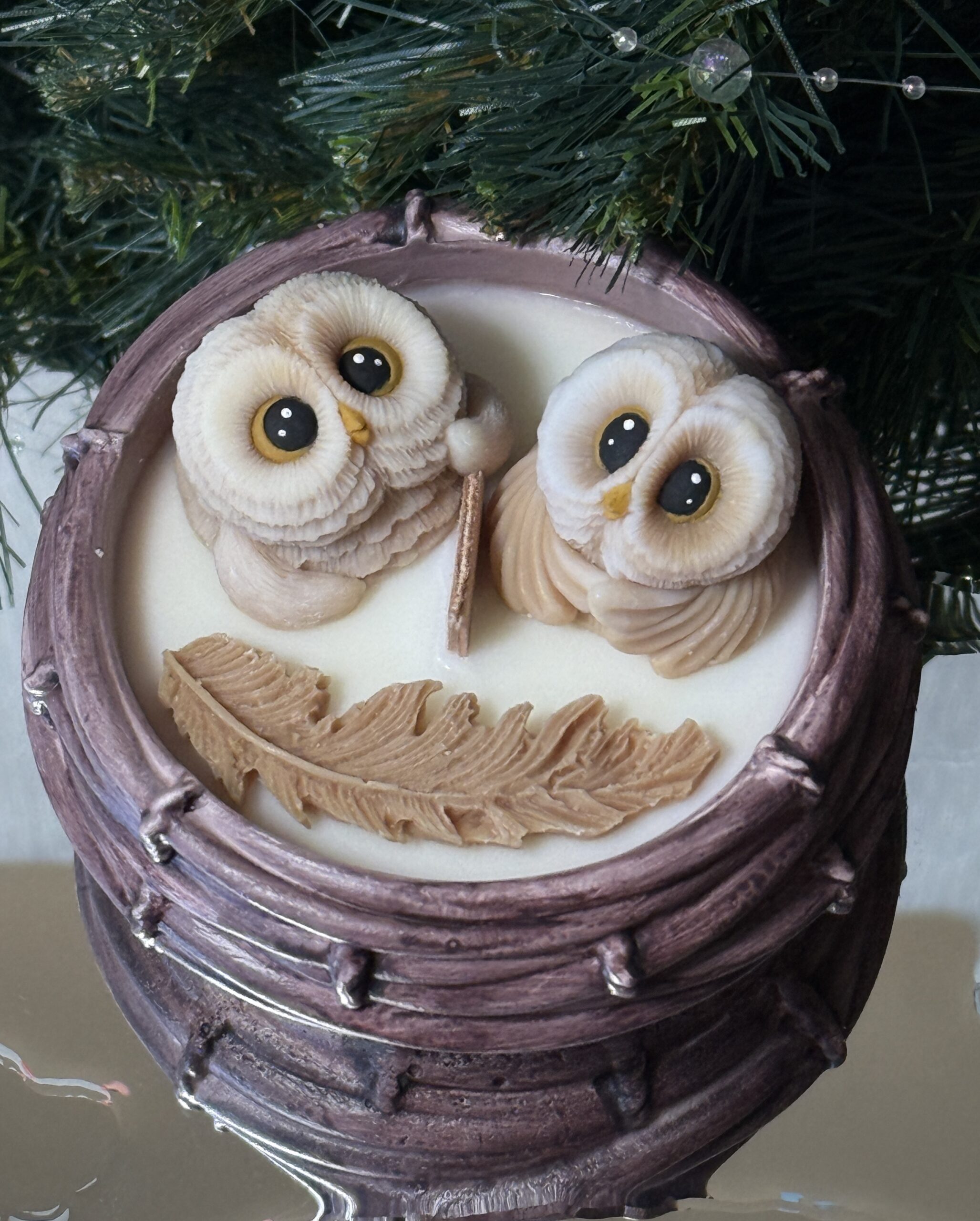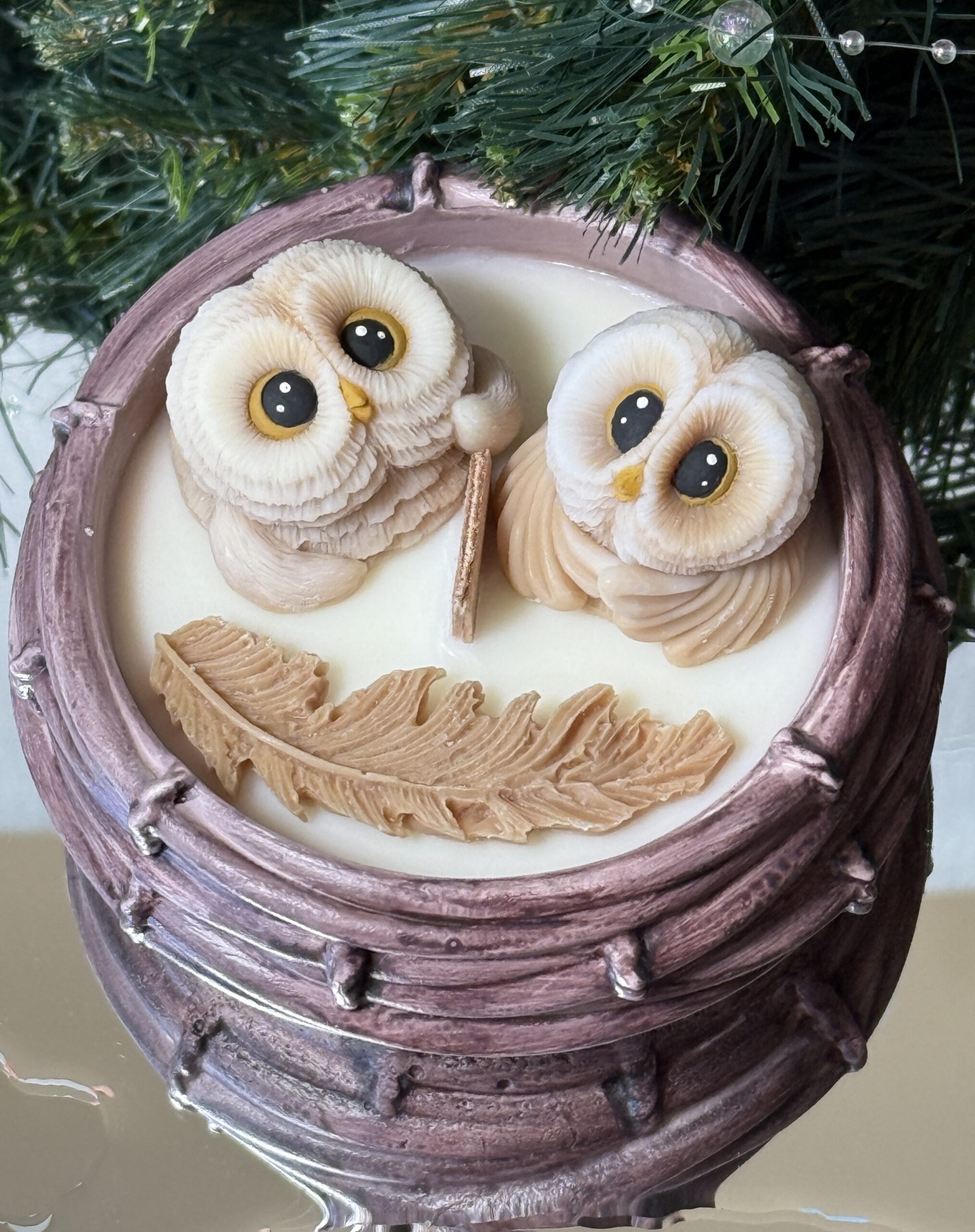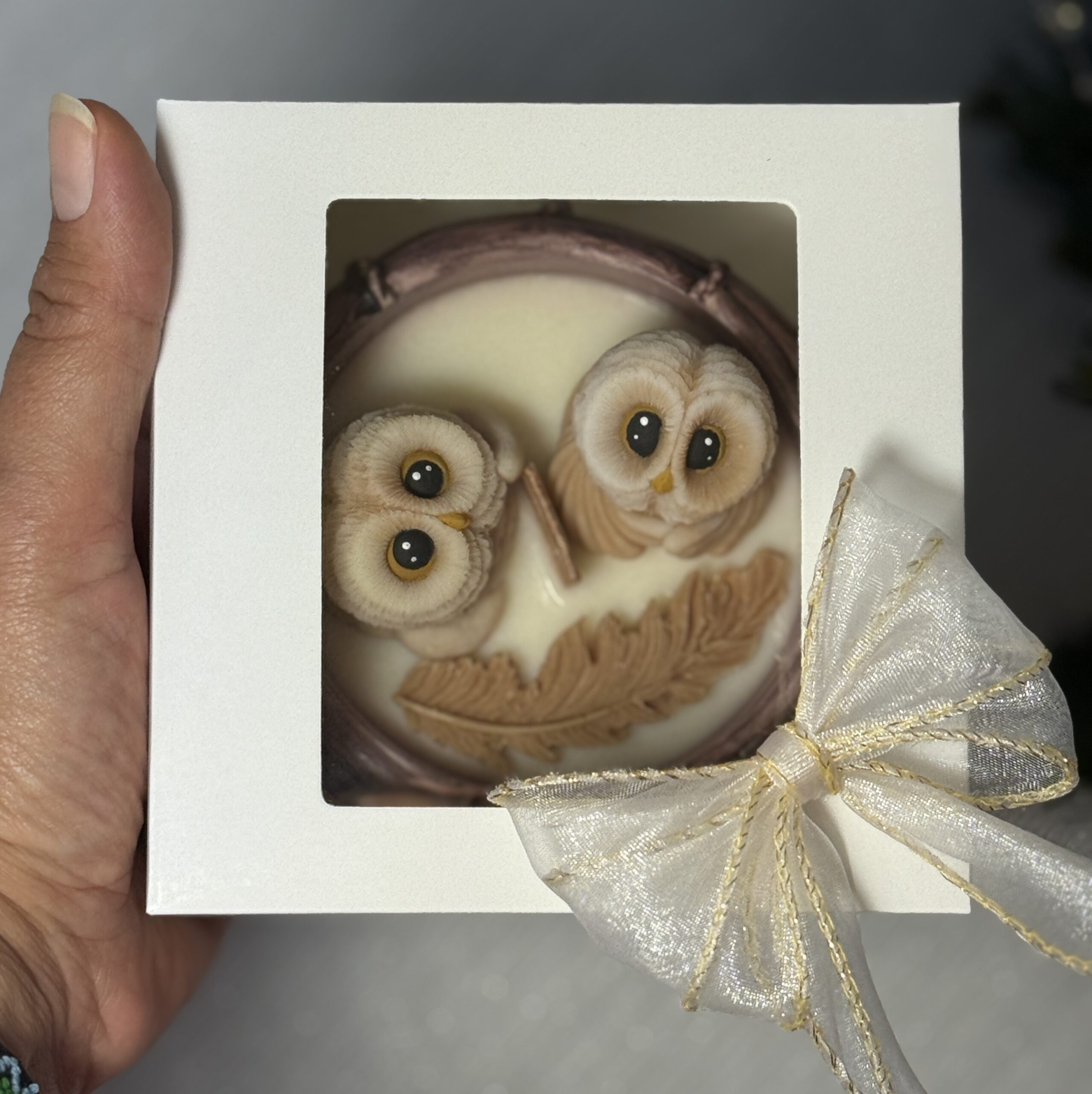 Bring a touch of woodland magic into your home with this Owl Gift for Women – a handmade soy wax candle with a natural wood wick. Featuring two charming owls and a delicate feather motif, this limited-edition piece is as much a work of art as it is a candle. Perfect for gifting or creating a cosy seasonal atmosphere, it’s a keepsake to treasure long after the wax has burned.