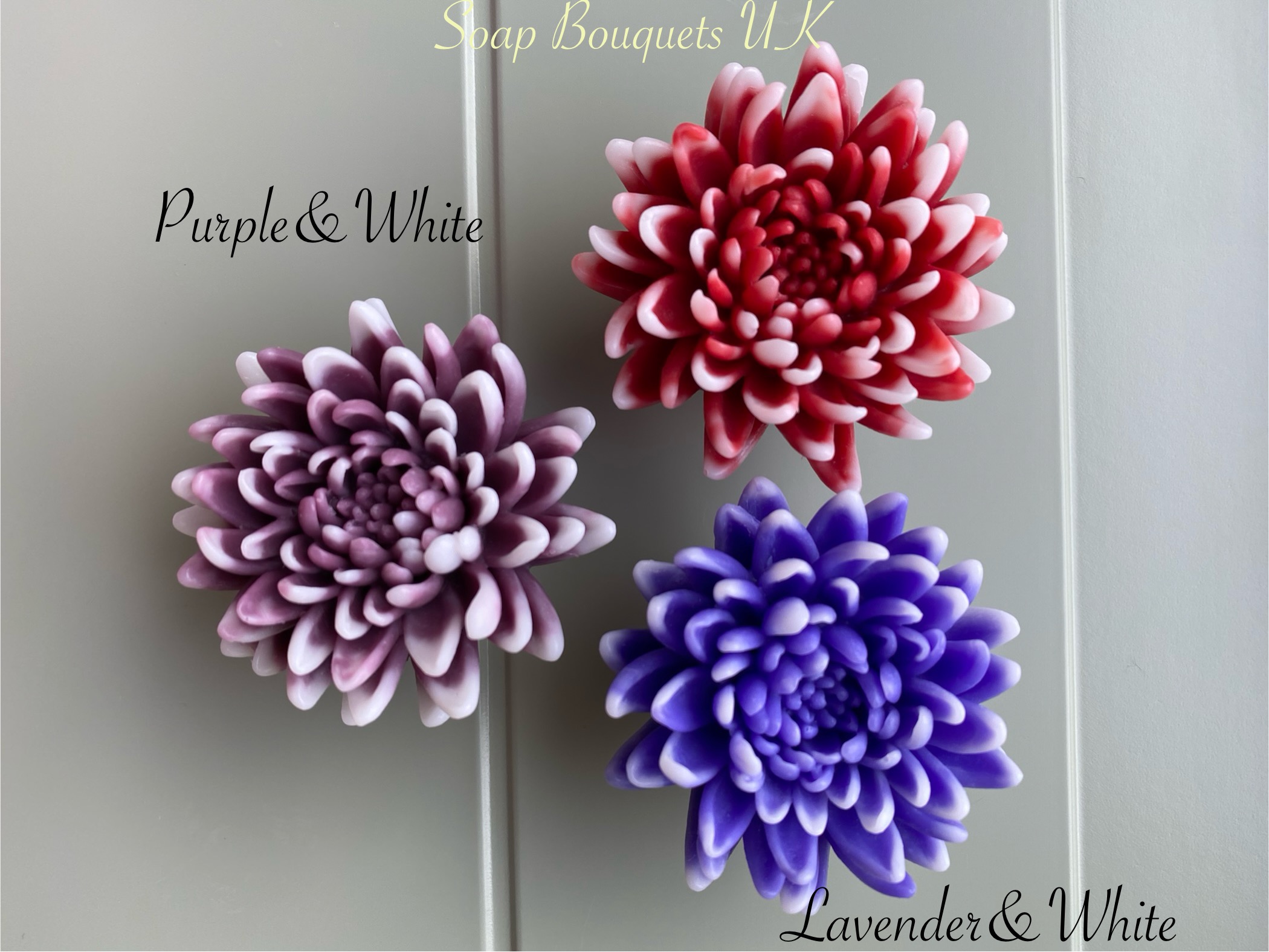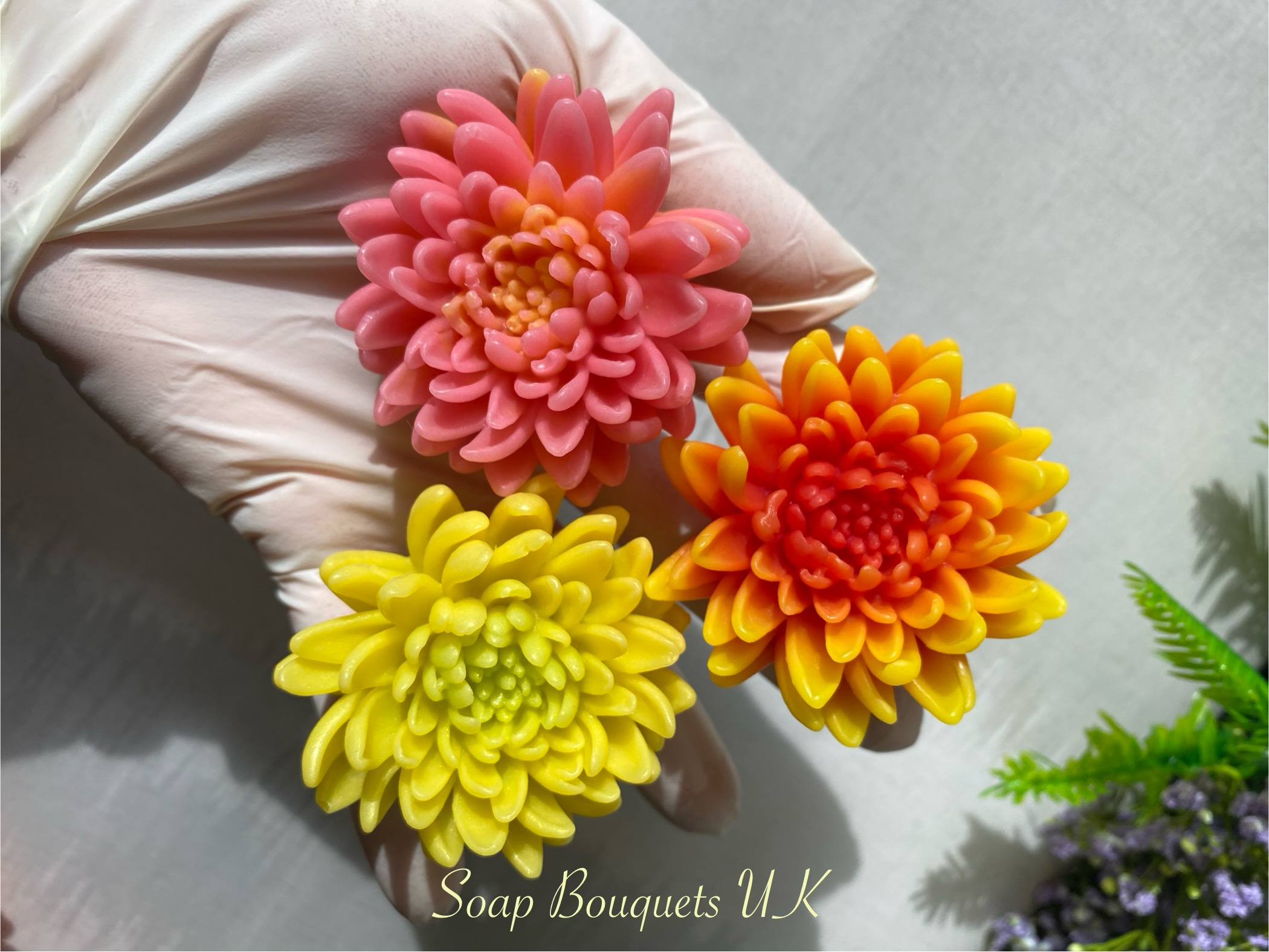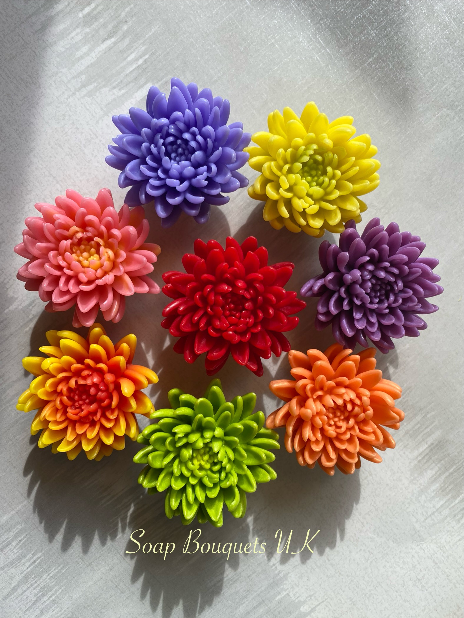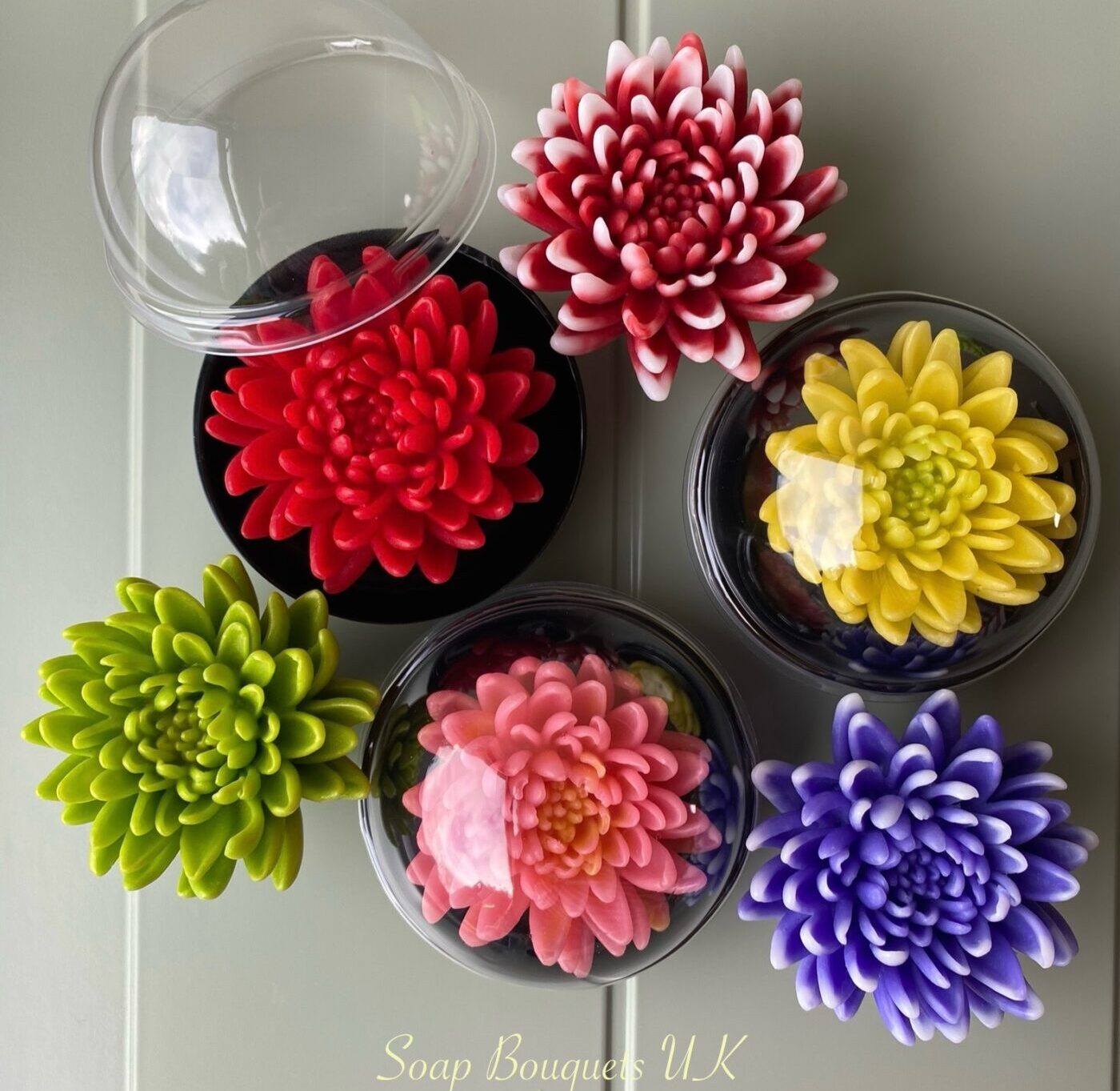 A beautifully handcrafted chrysanthemum soap gift, perfect for teachers, doctors, and colleagues. Made from vegan handmade soap, delicately scented, and available in assorted colours. An elegant and practical soap flower gift for any occasion.