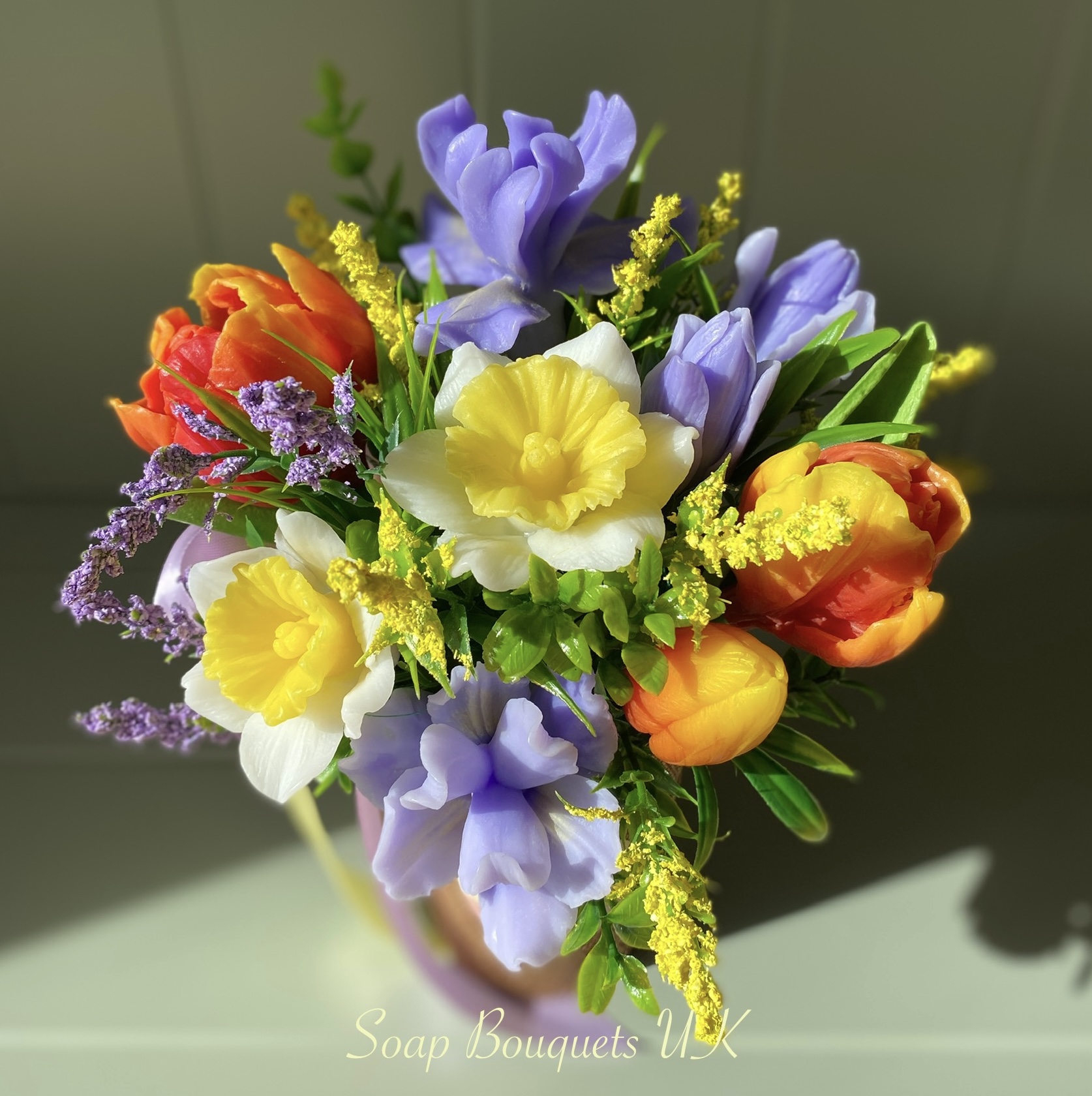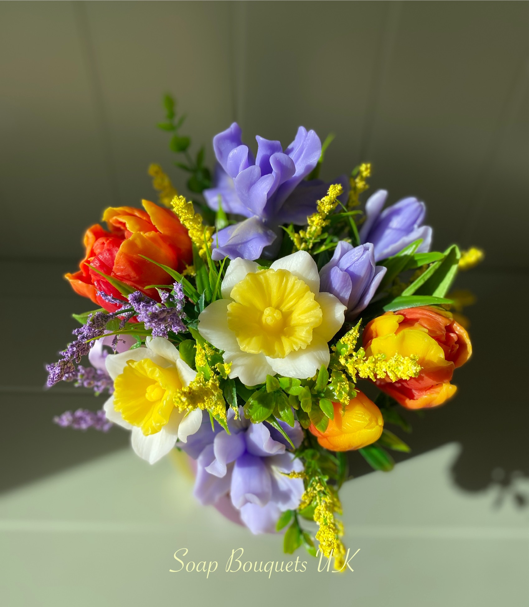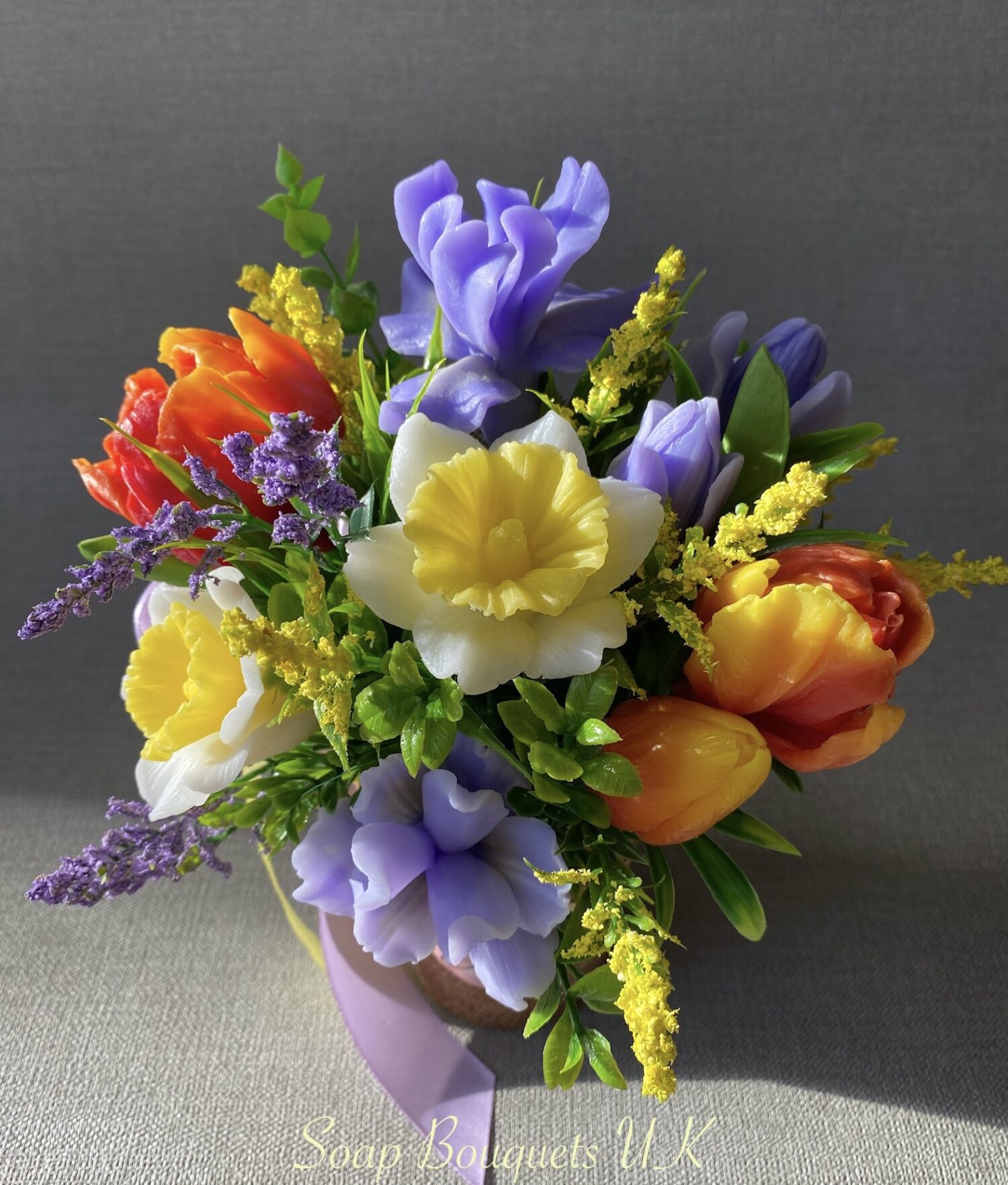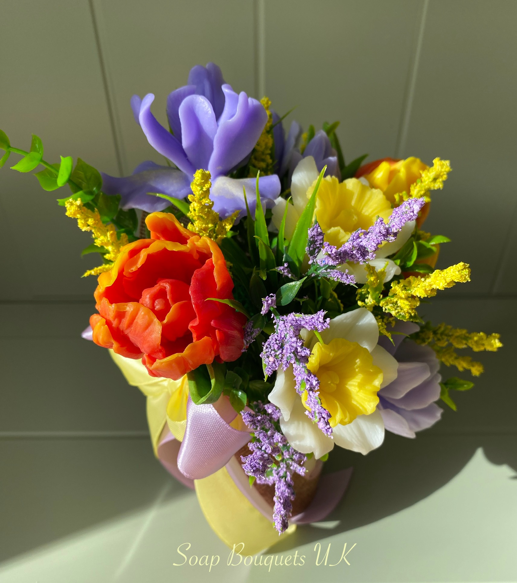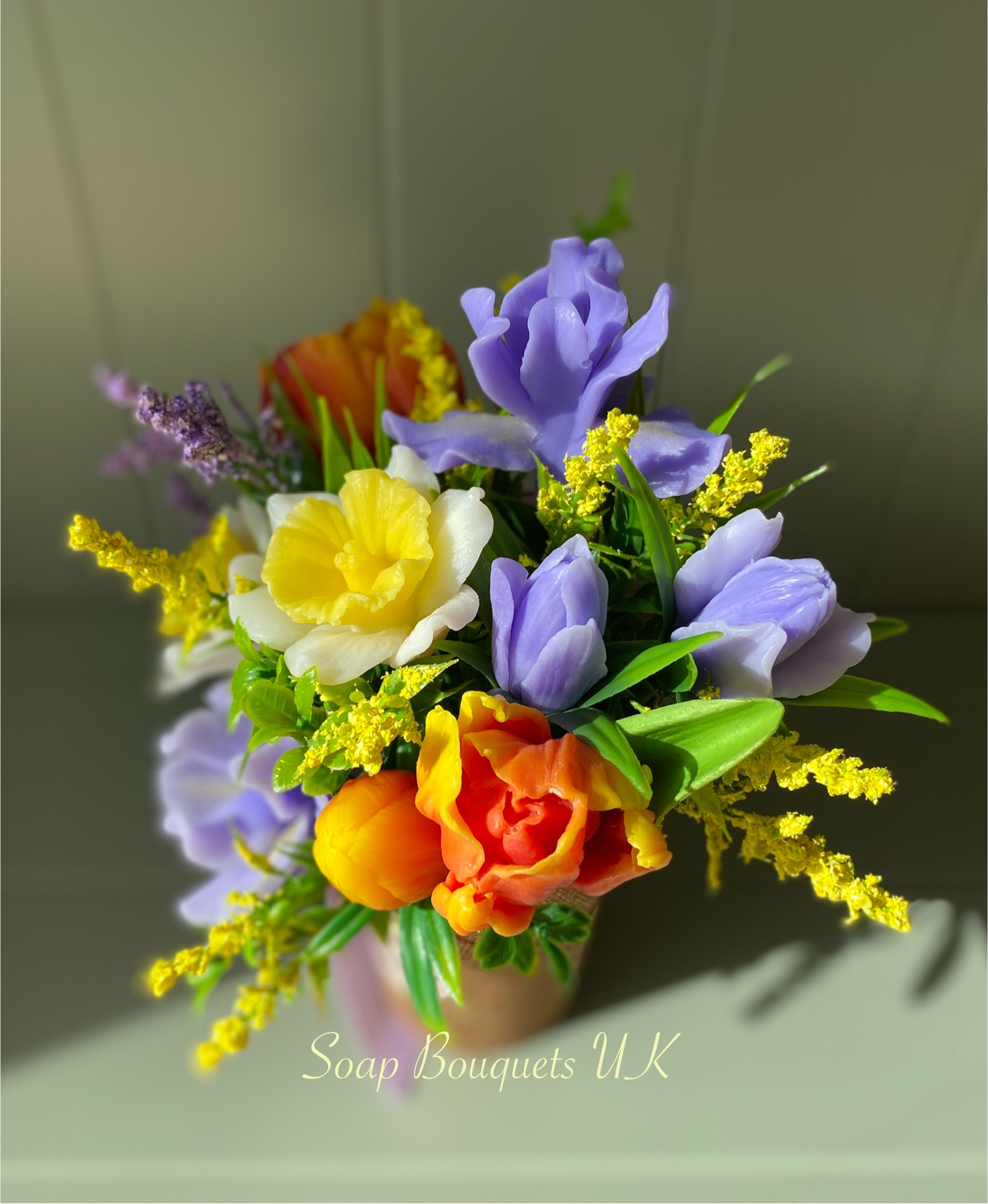 - Flowers: Includes vibrant red and yellow tulips, delicate lilac-hued irises, and classic golden-centred daffodils, all meticulously crafted from high-quality scented glycerine soap. Each bloom captures the essence of spring, bringing timeless beauty and a gentle floral fragrance into your home.