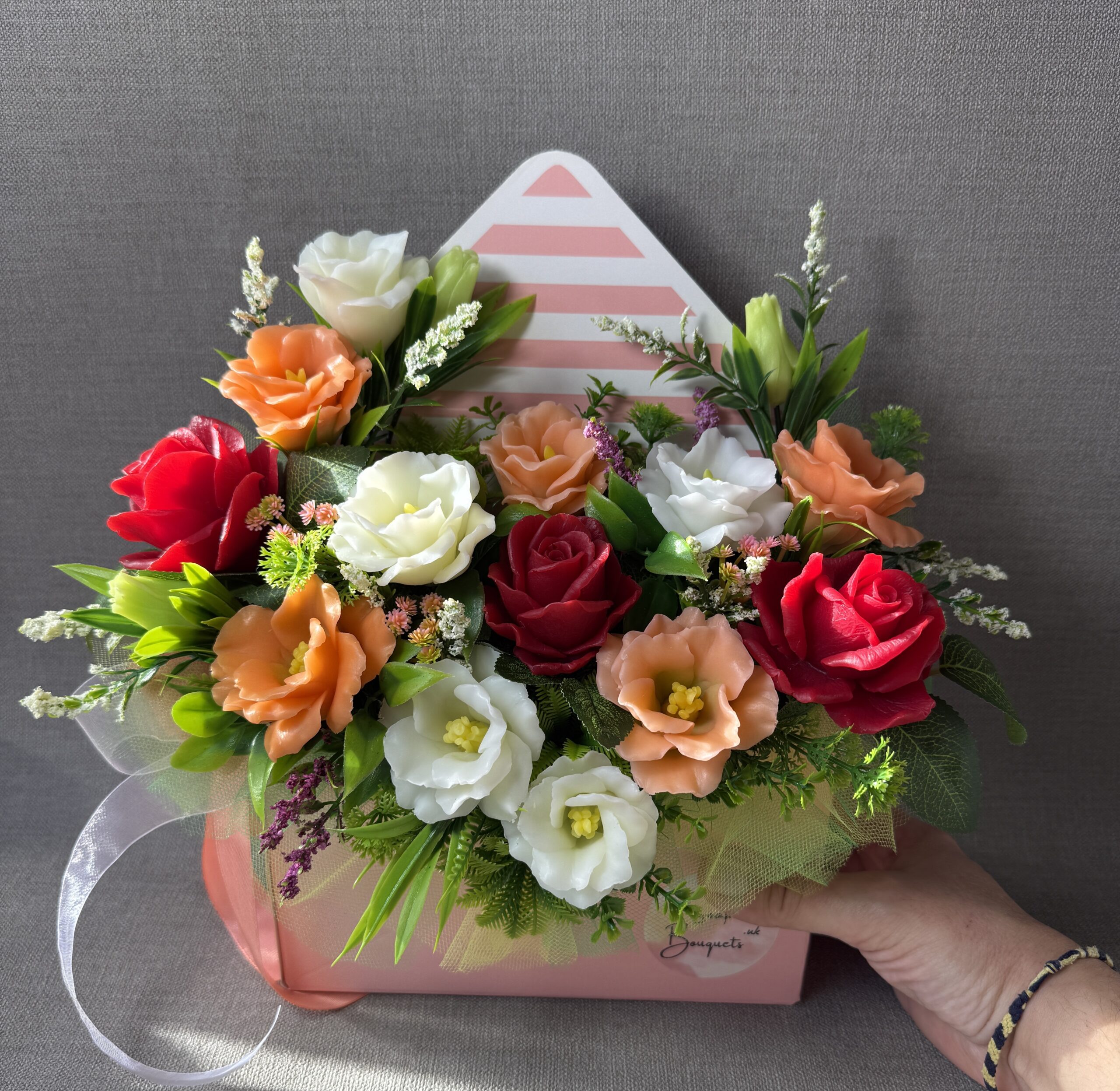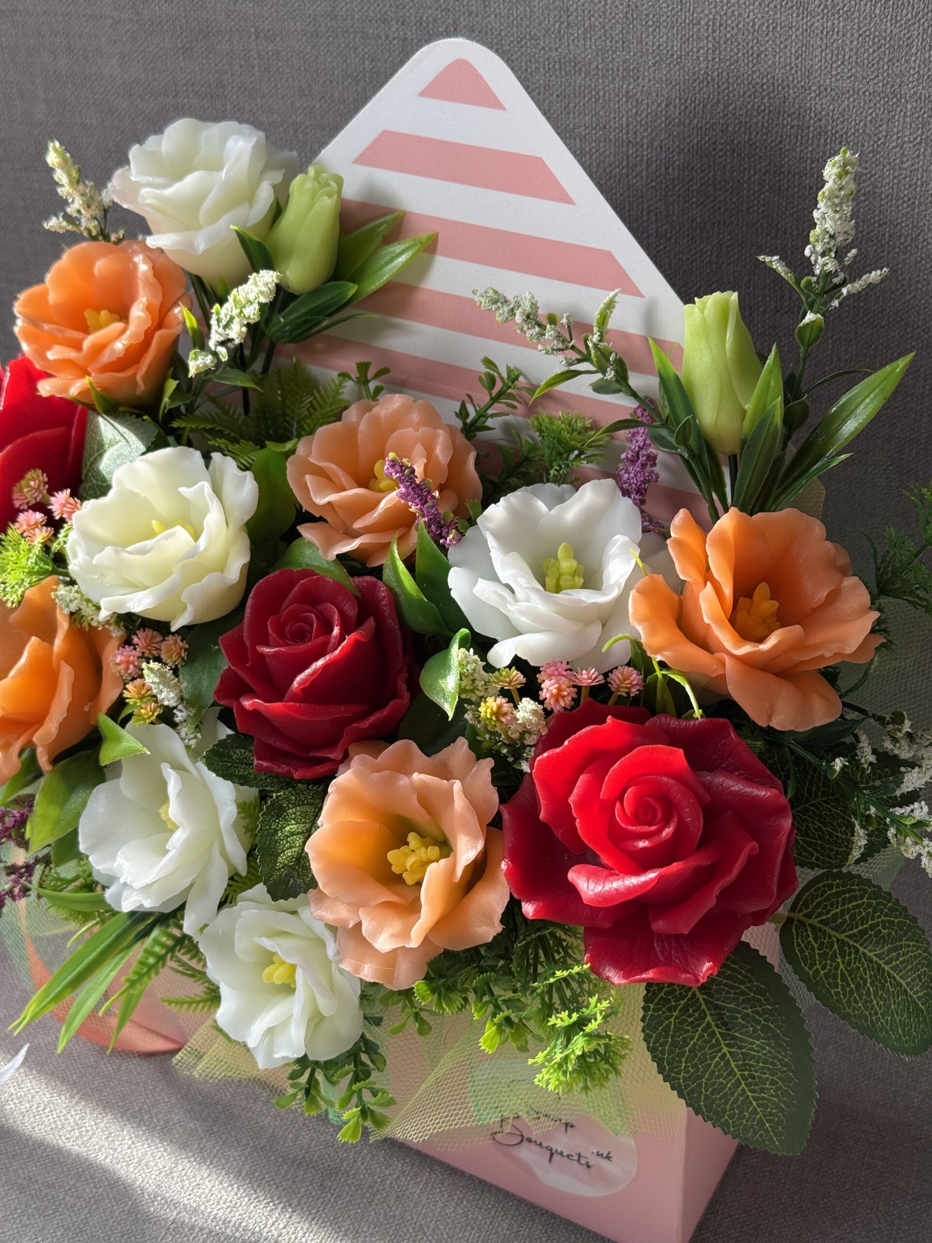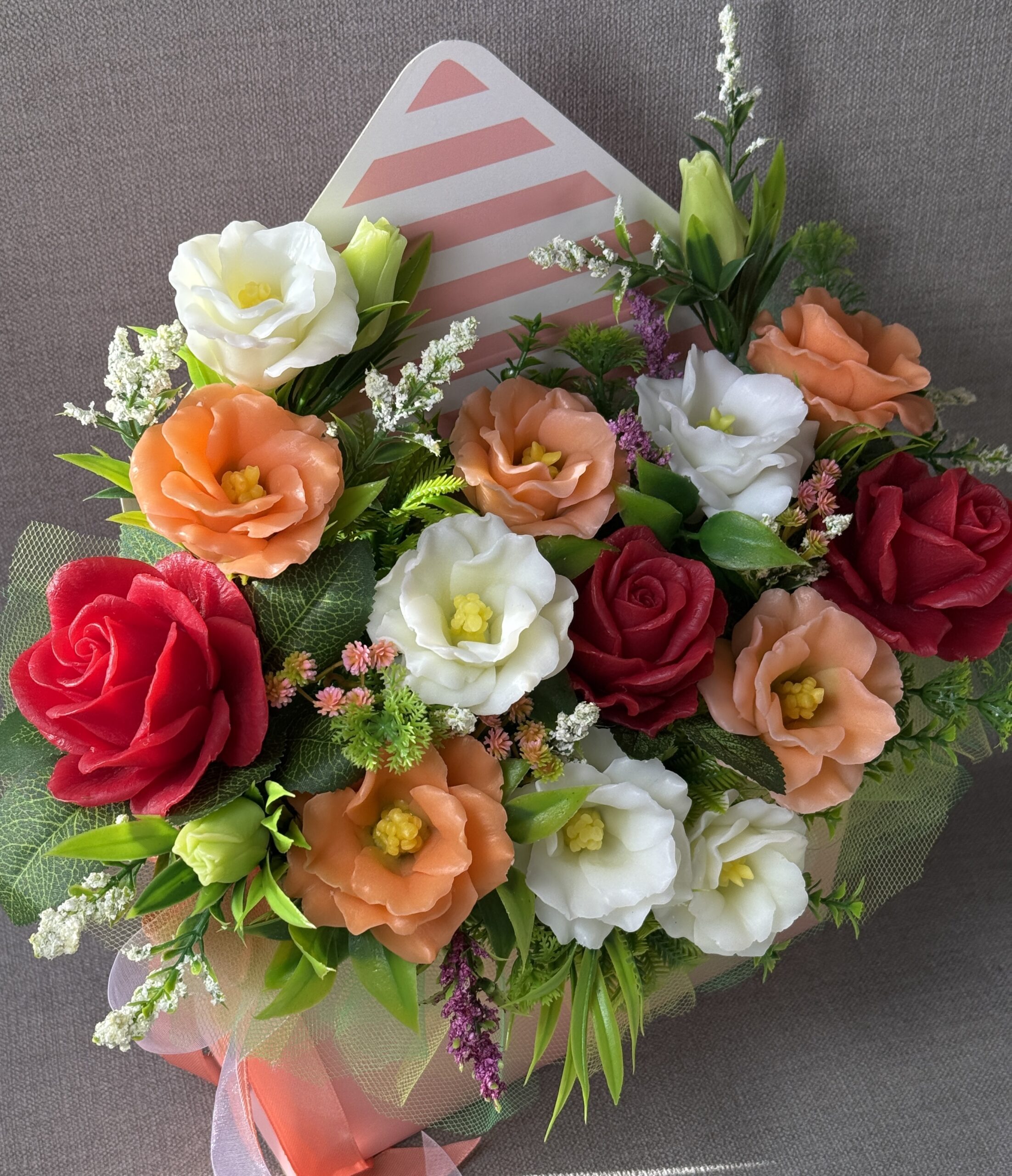 • Flowers: Includes soap flowers – 3 red roses, 10 lisianthus (peach & white), and buds, all crafted from high-quality scented glycerine soap. With 17 flowers in total, it combines beauty, fragrance, and sustainability.