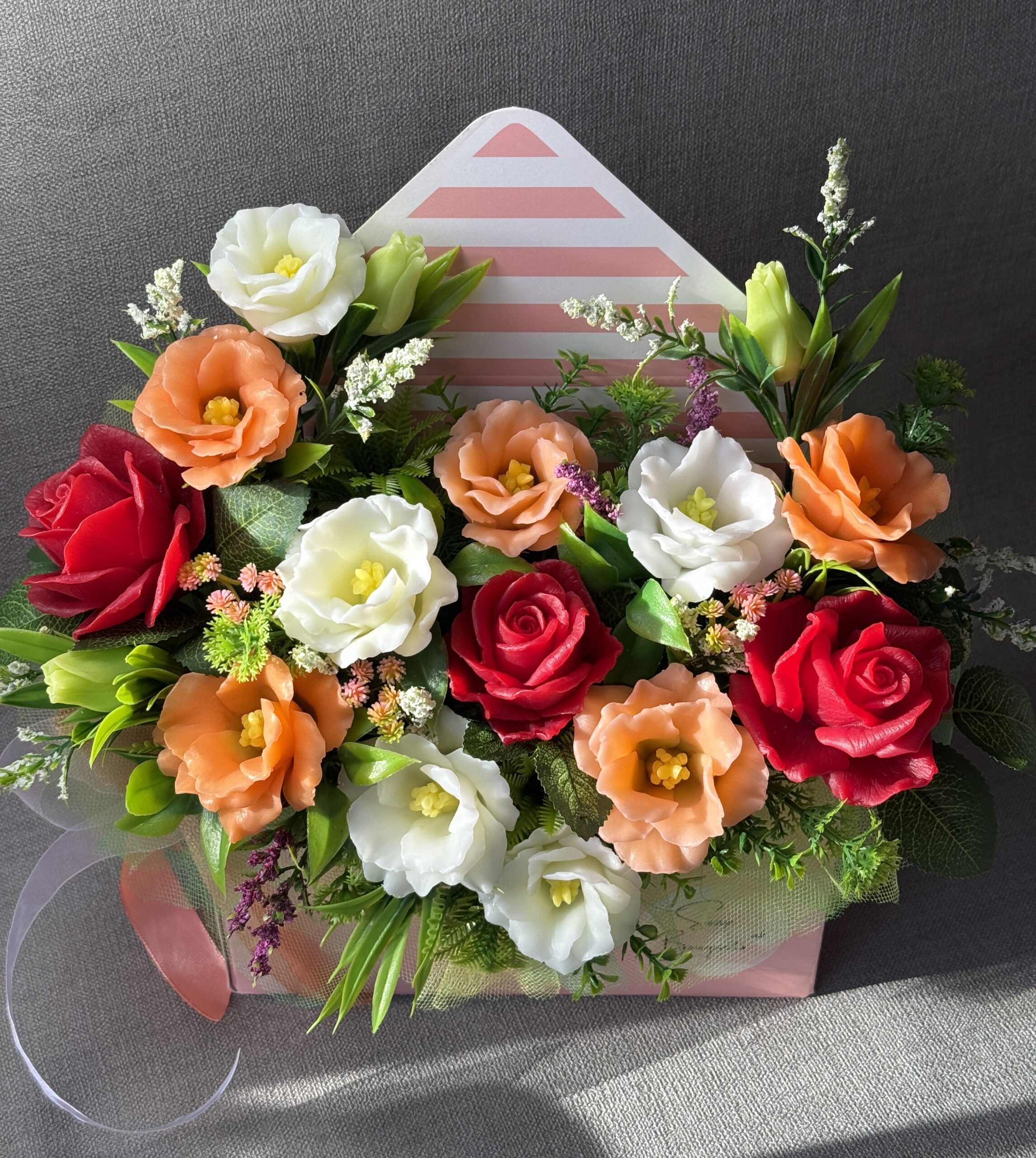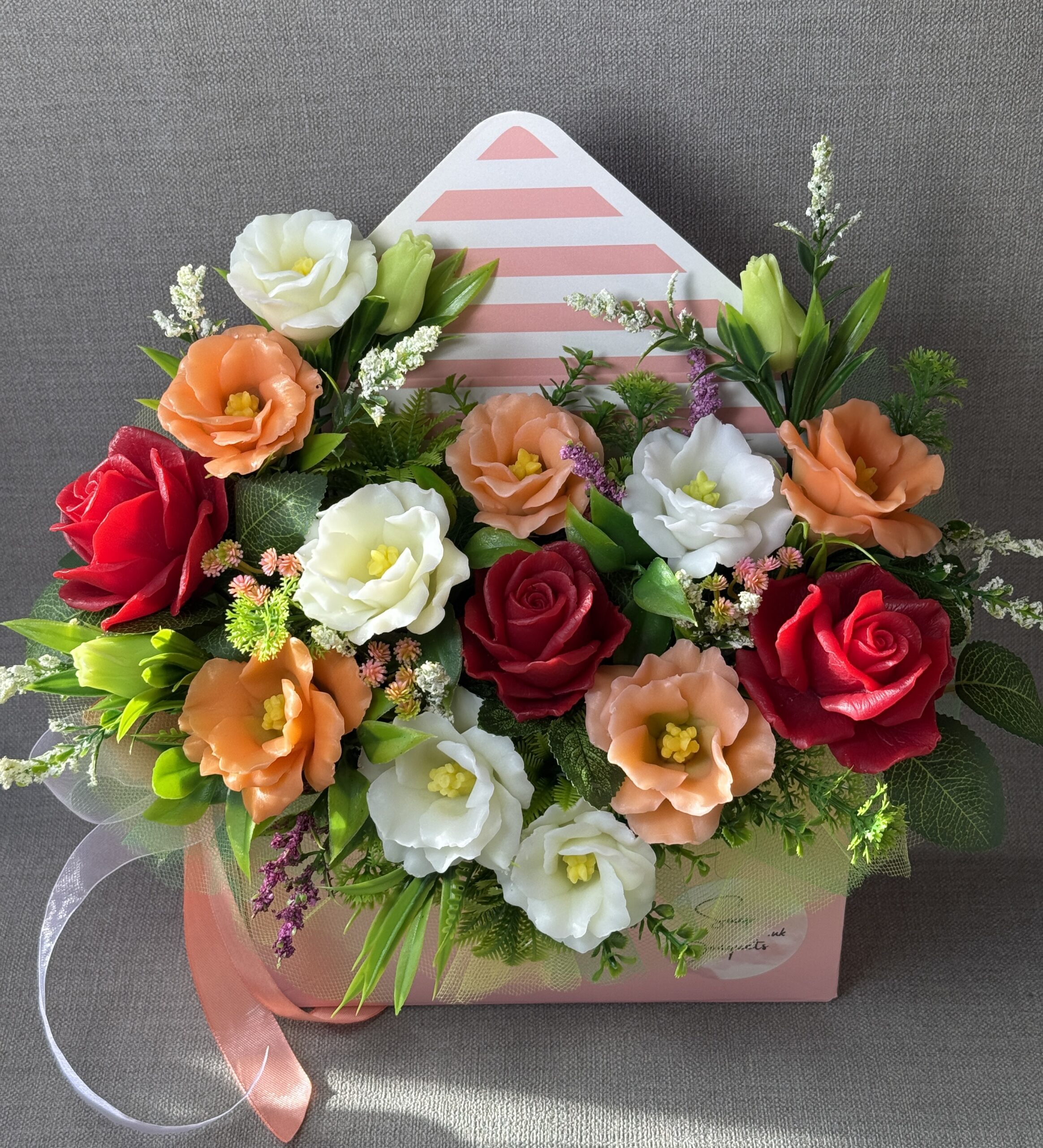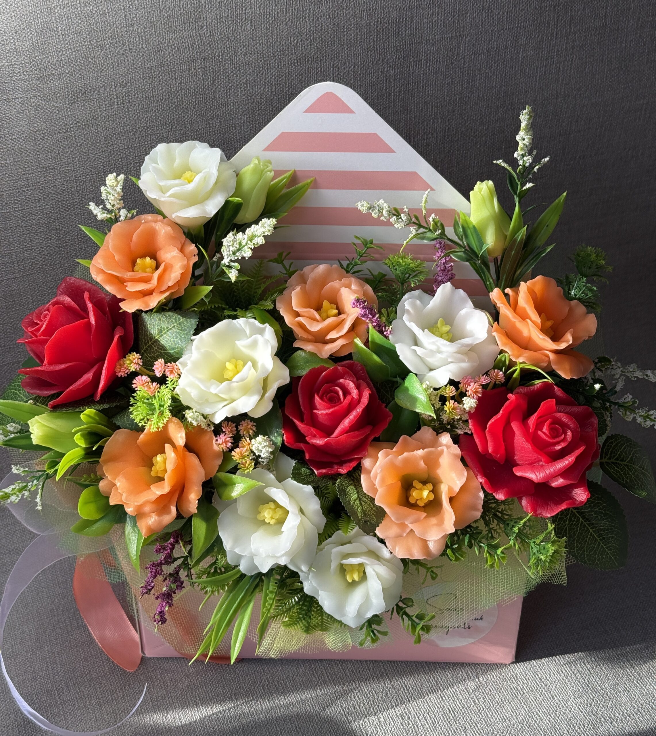• Flowers: Includes soap flowers – 3 red roses, 10 lisianthus (peach & white), and buds, all crafted from high-quality scented glycerine soap. With 17 flowers in total, it combines beauty, fragrance, and sustainability.